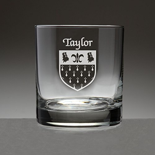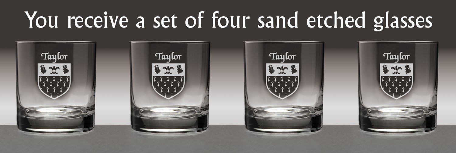 Taylor Irish Coat of Arms Tumbler Glasses If ye'll be havin' a wee bit of the Jameson whiskey on a cool evening, this will be the glass. Or Scotch, neat. A Cosmopolitan, perhaps. Or just a spot of lemonade, for that matter. Nicely balanced, clean-lined and just plain grown-up, the Tumbler's dignity is heightened by a sand-etched Irish coat of arms and family name. Why not yours? 11 oz. in size and dishwasher safe. Choose from over 1000 available Irish crests. USA.Washing Instructions:Dishwasher and microwave safe. Authentic Irish Family Coat of Arms Over 25 years of Heraldry Research Set of 4 Irish Coat of Arms Tumbler Glasses (Sand Etched) High quality sand etching with extra heavy basepattern:heavy basebottom diameter:3-3/16"maximum diameter:3-1/4"capacity:11 oz product height:3-1/2"