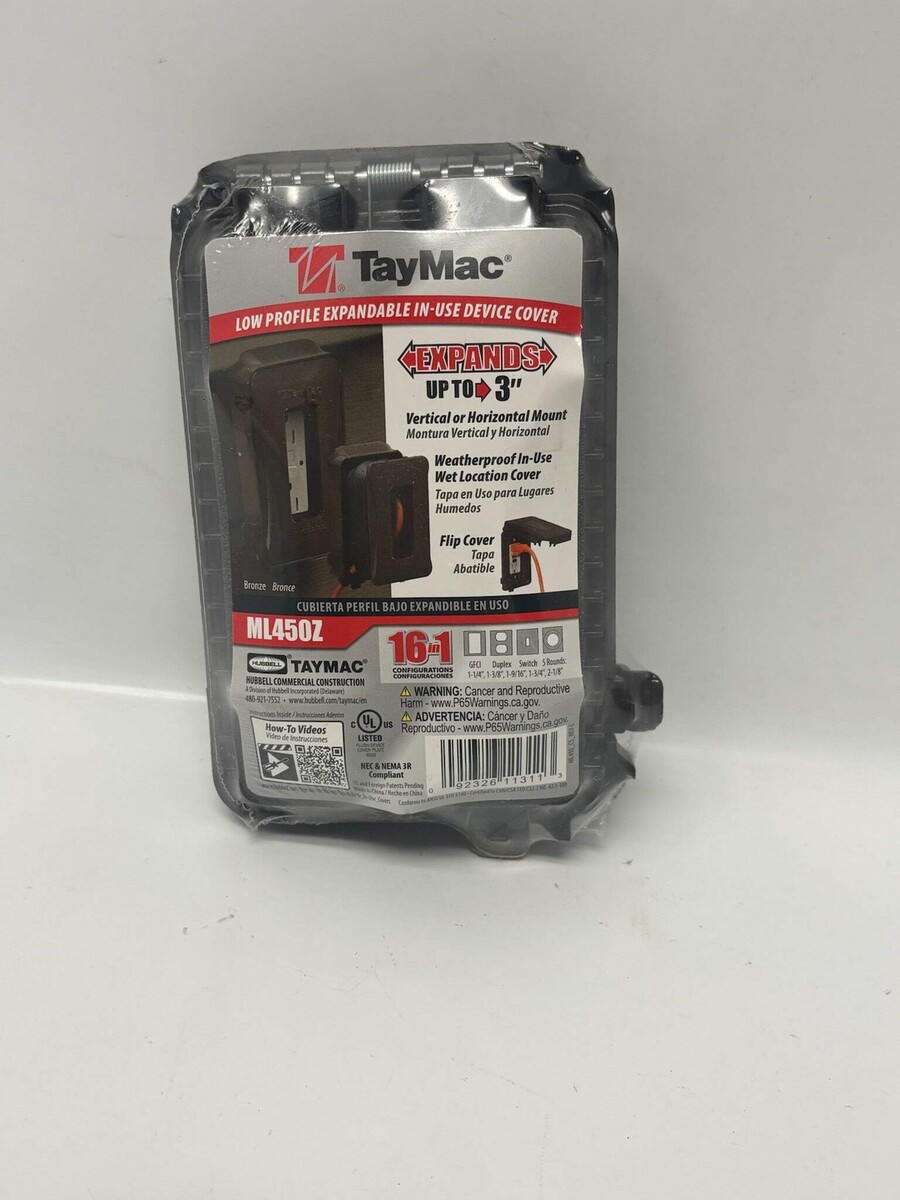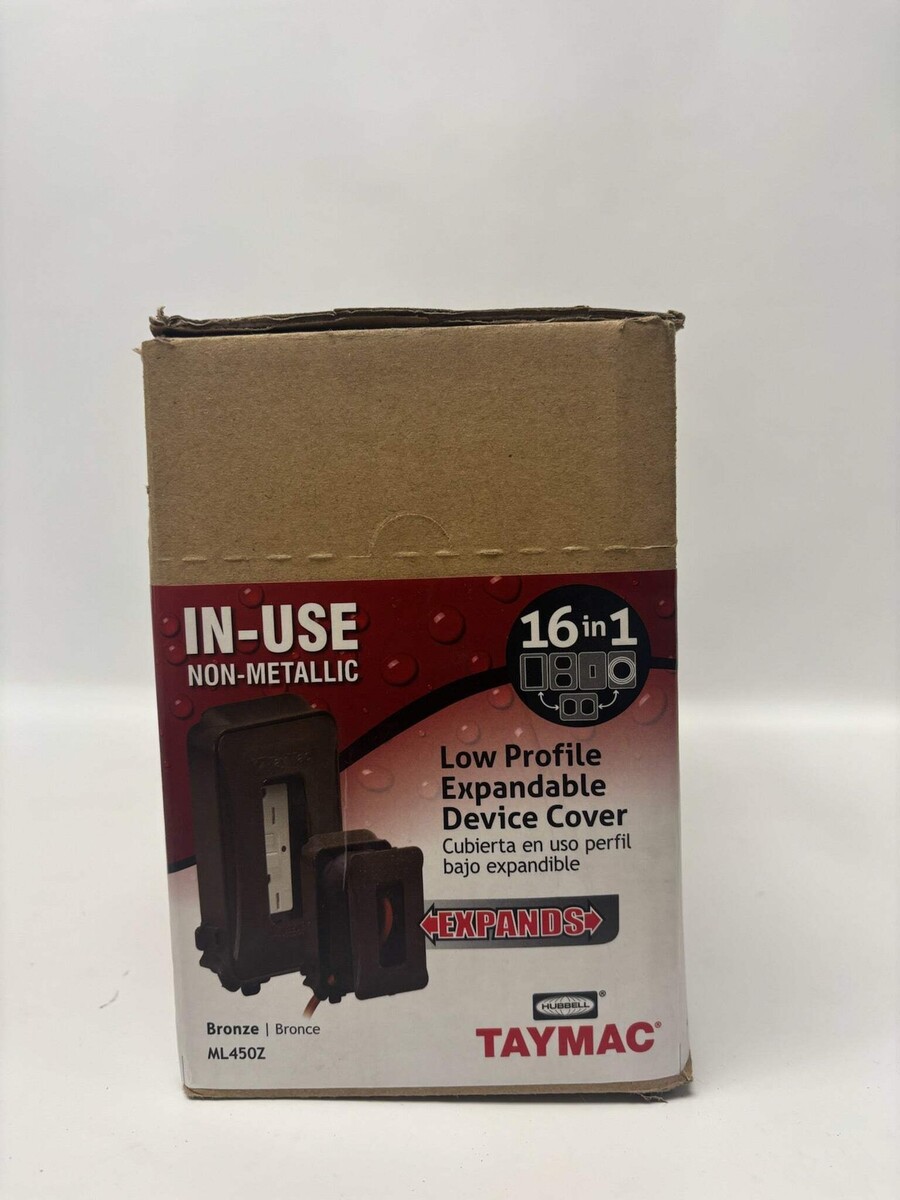Taymac ML450Z 1-Gang Expandable Weatherproof In-Use Cover, Bronze (10-Pack) New-Open Box ***Please See Reference Photos*** The ML450Z is a 1-gang, weatherproof ?while-in-use? outlet cover designed for outdoor/interior use where an electrical receptacle may remain plugged in and needs protection from the elements while still allowing access. It is made by the brand Taymac (a part of Hubbell). Listed by: Renee (Sales Team) "Every sunrise is a new invitation to chase your dreams with courage and gratitude." ? Unknown (A positive moment brought to you by Help Resale) About Us Welcome to Help Resale, your go-to consignment shop where value meets quality. At Help Resale, we're dedicated to providing you with an exceptional shopping experience, whether you're looking to find the best deals or consign your items. Need to buy a product, but don't see it in our store? Please feel free to reach out to us and we will help you find it! Help Resale 7200 Fair Oaks Blvd Suite 120 Carmichael CA 95608 Business Hours: Monday-Friday: 9:00 am to 5:00 pm (PST) All product and company names are trademarks TM or registered trademarks of their respective holders. Use of them does not imply any affiliation with or endorsement by them.