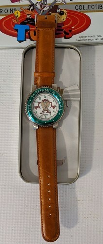 A vendre est une montre Taz Tazmanian Devil comme neuve 1994 Looney Toons 2200/67 en cuir marron dans une boîte. Le lot aura besoin d'une nouvelle batterie.