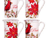 The Home Essentials Tea 2-Piece Holiday Sentiments mug set features a festive design with a cardinal bird and poinsettia pattern, perfect for Christmas celebrations. Made of durable stoneware, this set includes four 10oz mugs with coasters, making it ideal for serving tea or coffee during the holiday season. The red and white color scheme adds a touch of holiday cheer to your kitchen or dining table, creating a warm and inviting atmosphere for your loved ones.