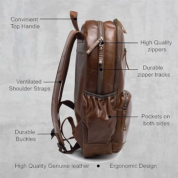 ? HANDCRAFTED: Handcrafted by experienced craftsmen, Vintage inspired design combined with the Premium leather gives a rich classy look. Solid Metal hardware adds to both the strength and looks in the vintage leather backpack.