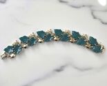 ?Style/Features: Add a lovely touch of mid-century style with this striking 1950s thermoset bracelet. This unsigned foliage piece features beautiful teal green lucite, clear rhinestones and faux white pearls. Perfect for holiday parties and everyday retro glamour. Priced affordability to reflect it's honest vintage life, it remains a fantastic piece for any collection. Ships in a teal bracelet box.