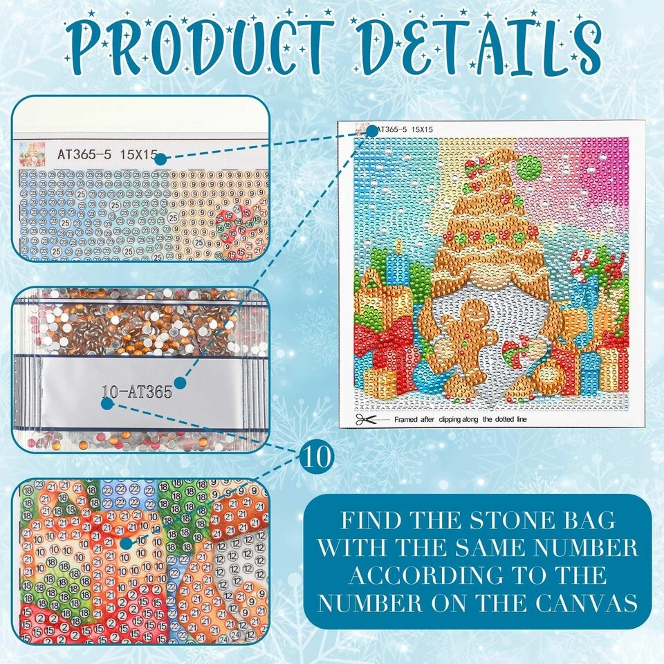 Enough Package: our Christmas diamond kit can meet most needs in the creative process, the size is about 6 x 6 inches/ 15 x 15 cm; In addition to the 9 pieces of gnome canvas, you also get 3 diamond plates, 6 jelly gels and 3 pens to ensure diamond placement and long lasting for the future, maintaining shine for years