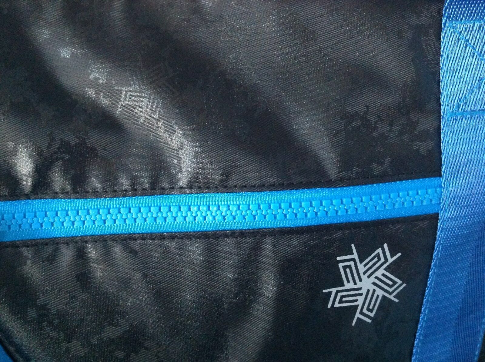 HAS 4 HEAVY- BLUE NYLON ZIPPERS WITH BLUE FAUX LEATHER ZIPPER PULLS