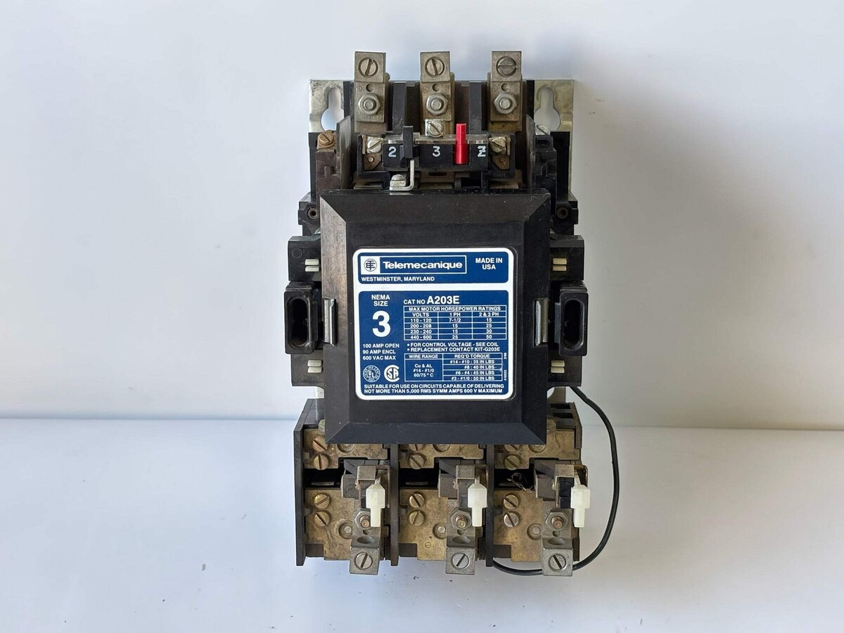 Telemecanique A203E Size 3 Full-Voltage Magnetic Starter 100 A Frame New - No Box The Telemecanique A203E is a Size 3 full-voltage magnetic motor starter designed for three-phase industrial motor applications. It features a 100 amp frame and supports major motor ratings such as up to 50 hp at 480 V under certain coil configurations. The device typically includes a 110-120 V control coil for easy integration into standard control circuits. With its robust construction, it accommodates auxiliary contacts and mounting in panel or enclosure setups. The starter allows for reliable across-the-line motor starting and incorporates thermal overload protection when paired with compatible devices. Ideal for control panels requiring compact size-3 starters in heavy duty environments. Listed by: Maksim (Sales Team) ?Don?t dream of winning, train for it!?~ Mo Farah (A positive moment brought to you by Help Resale) About Us Welcome to Help Resale, your go-to consignment shop where value meets quality. At Help Resale, we're dedicated to providing you with an exceptional shopping experience, whether you're looking to find the best deals or consign your items. Need to buy a product, but don't see it in our store? Please feel free to reach out to us and we will help you find it! Help Resale 7200 Fair Oaks Blvd Suite 120 Carmichael CA 95608 Business Hours: Monday-Friday: 9:00 am to 5:00 pm (PST) All product and company names are trademarks TM or registered trademarks of their respective holders. Use of them does not imply any affiliation with or endorsement by them.