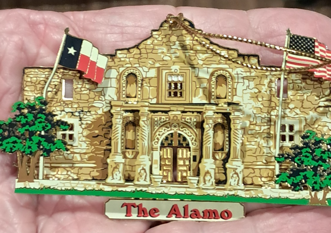 - The Alamo Souvenir Ornament USA 3.5 in Gold with enamel finish 3 dimensional