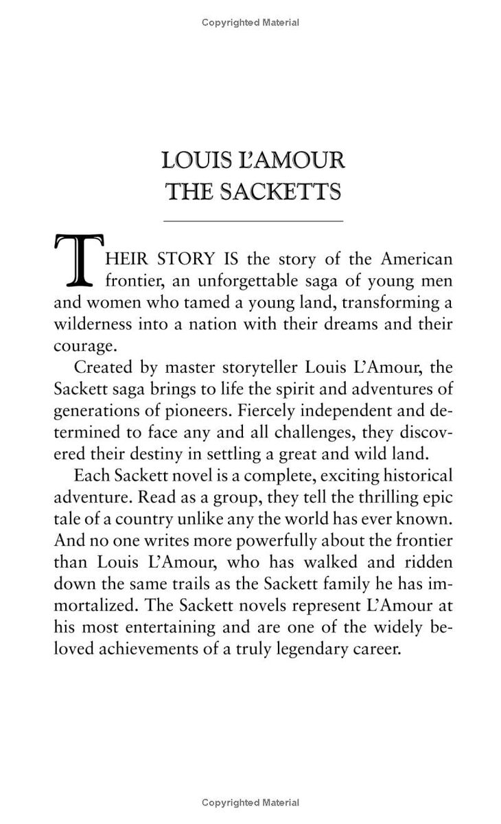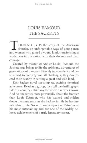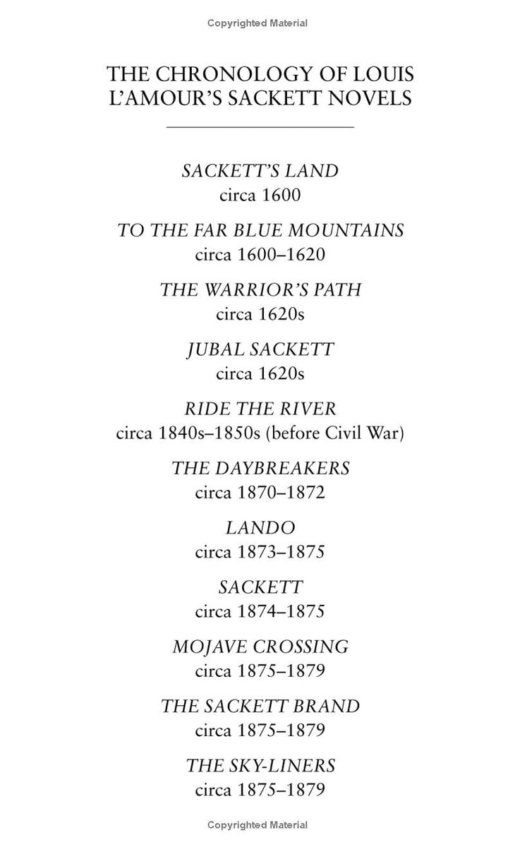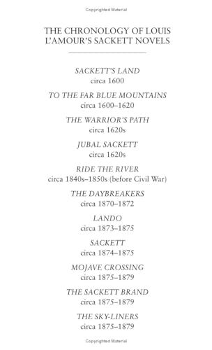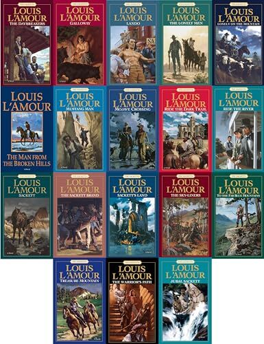Product description: Complete 18 Volume Set 3600 pages give or take Book list as Follows: 1. Sacketts Land 2. To the Far Blue Mountains 3. The Daybreakers 4. Sackett 5. Lando 6. Mojave Crossing 7. The Sackett Brand 8. The Lonely Men 9. Treasure Mountain 10. Mustang Man 11. Galloway 12. The Sky-liners 13. The Man From the Broken Hills 14. Ride the Dark Trail 15. The Warriors Path 16. Lonely On the Mountain 17. Ride the River 18. Jubal Sackett