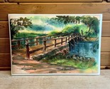 Classic American watercolor painting, with plastic covering for easy cleaning and protection. Has some wear and warp from age, use and storage.