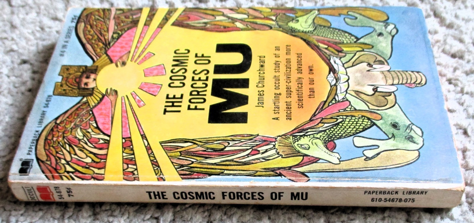 192 page mass market paperback titled THE COSMIC FORCES OF MU by James Churchward/ Paperback Library # 54-678, First printing, May 1968/ Cosmic Forces of Mu by Colonel James Churchward, published in 1934. Part of the controversial writings of James Churchward, an endorser of a theory of an immense continent which once covered nearly one-half of the Pacific Ocean called Mu. He claimed this vast continent and culture was the center of civilization some 25,000 years ago and dates back 200,000 years. Churchward?s extensive search for the lost continent took him from the vaults of the Indian temple to the four corners of the world. This book seeks to show some of the scientific concepts behind the missing continent to prove the theories of its existence.