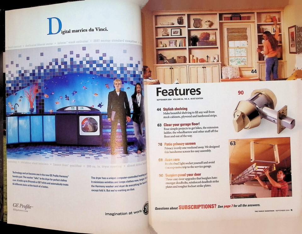 Explore the world of do-it-yourself projects with this September 2004 issue of The Family Handyman. The cover story features detailed plans for building elegant showcase shelves using affordable stock cabinets, a popular trend in the early 2000s that made high-end looks accessible. This issue captures the spirit of the booming home improvement era, offering practical advice on everything from garage organization to enhancing backyard privacy. A fantastic resource for woodworkers, DIY enthusiasts, and collectors of 2000s-era ephemera.