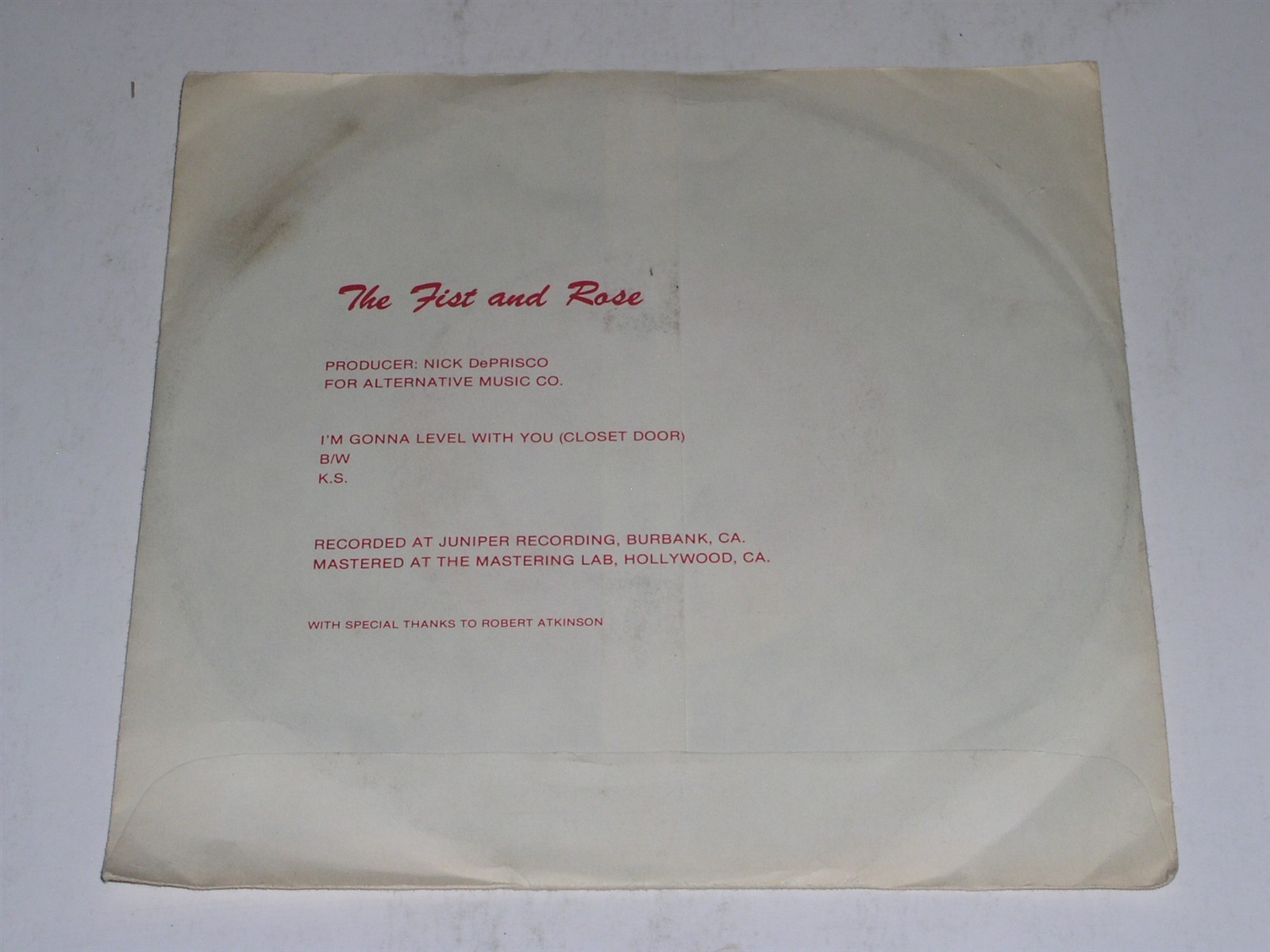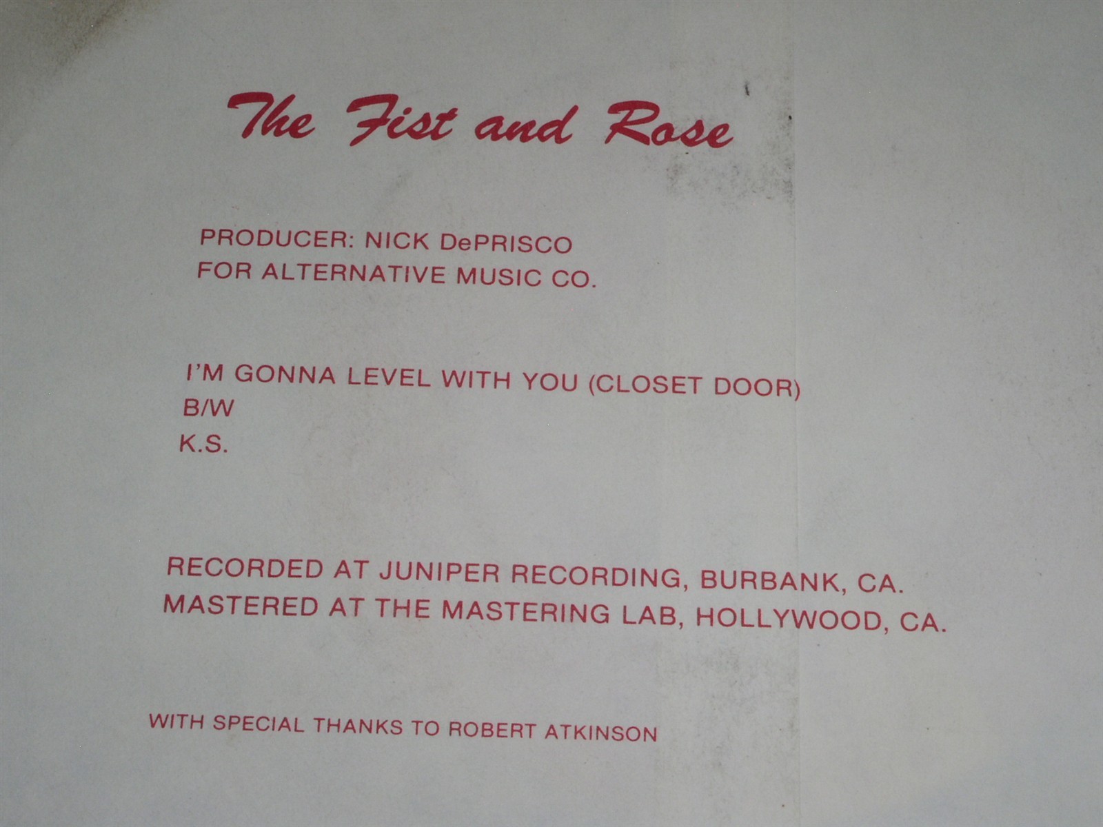 This is a very rare vintage 45 rpm phonograph record by The Fist And Rose, entitled, "I'm Gonna Level with You (Closet Door)". Flipside: "K.S.". Record label: Double Scorpion DS-FR3.