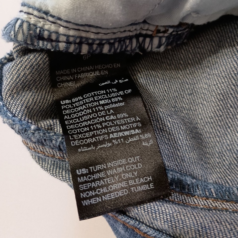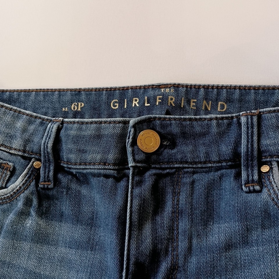 The Girlfriend Slim Leg Ankle Jeans in size 6P feature a medium wash with floral accents, adding a touch of femininity to the classic denim style. Made from a comfortable cotton blend fabric, these jeans have a zip and button closure, a mid-rise fit, and a slimming feature. The ankle length and slim fit make them perfect for a stylish and flattering look, ideal for summer, fall, and spring seasons. Normal wear. All sizes are approximate.