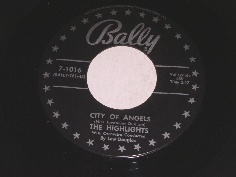 This is a vintage 45 rpm phonograph record by The Highlights entitled, "City Of Angels". Flipside: "Listen, My Love". Record Label: Bally 7-1016.