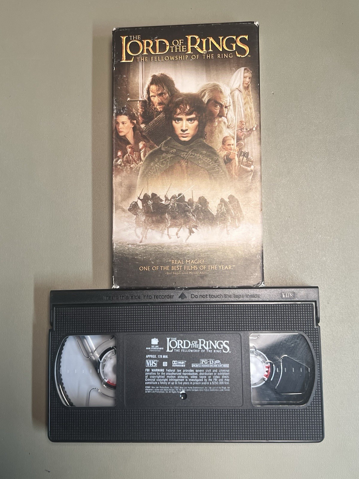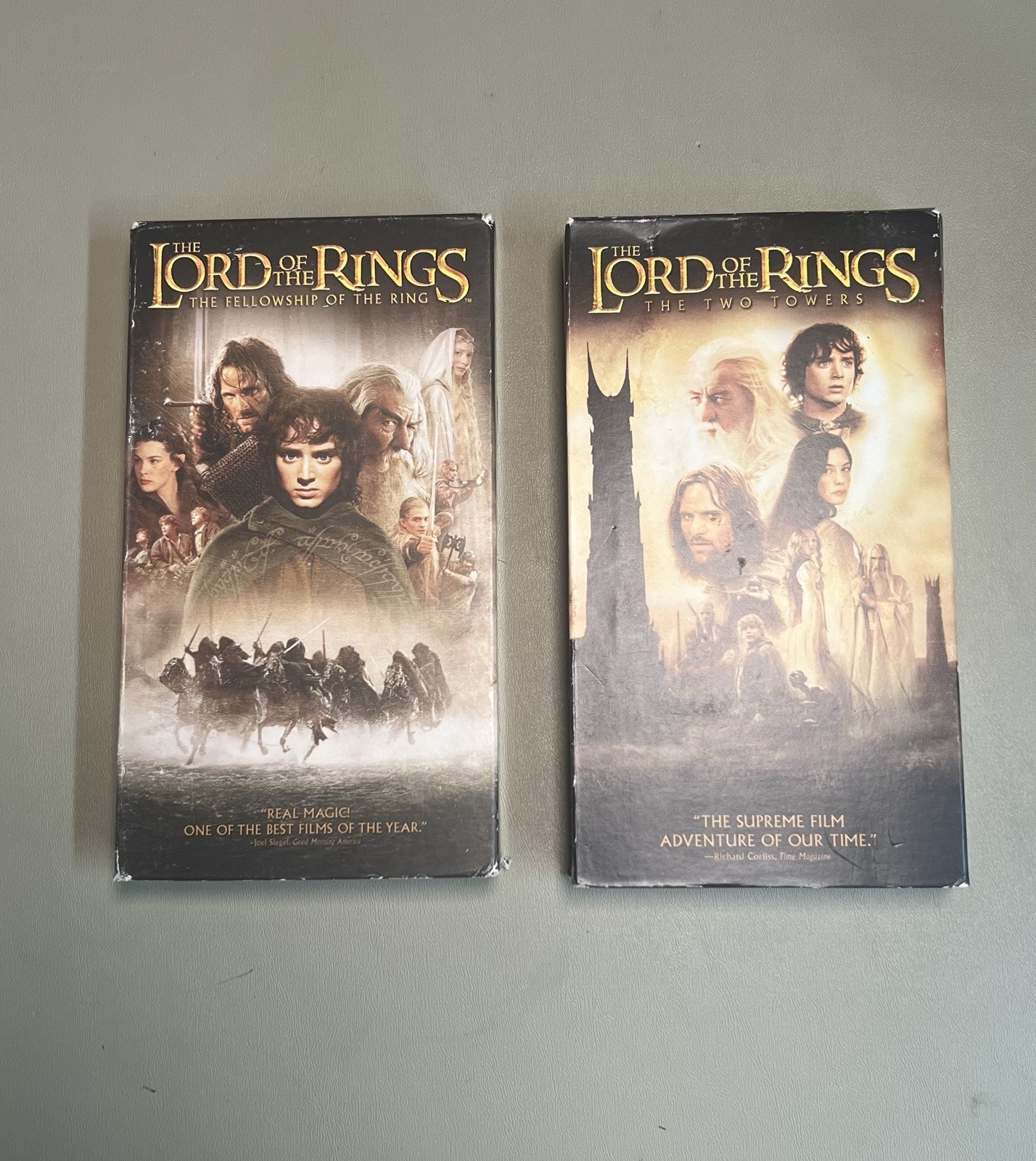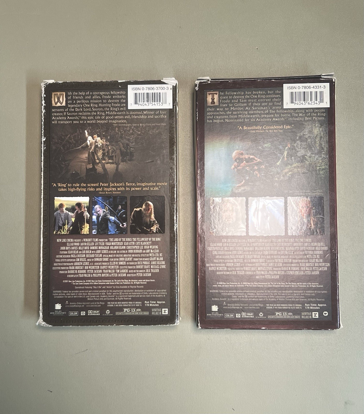 The Lord of the Rings - 2 VHS Set includes the movie "Lord of the Rings: The Fellowship of the Ring" released in 2001. This action and adventure film is rated PG-13 and produced by New Line Home Video. Fans of the fantasy epic can enjoy this classic VHS set to watch the first installment of the beloved trilogy. The second vhs is ?The Lord Of The Rings: The Two Towers?.