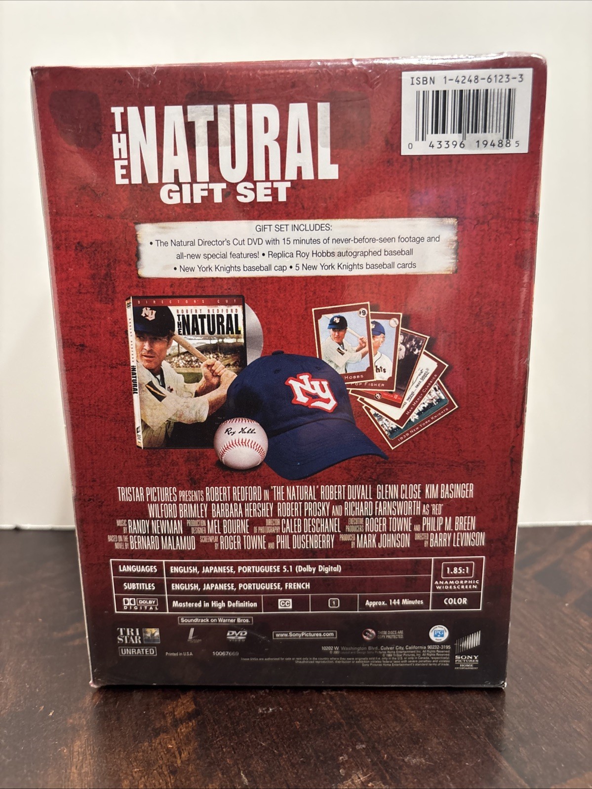 The product is a special edition DVD gift set of the movie "The Natural" directed by Robert Redford. This version includes a Director's Cut with a baseball card cap. The DVD features multiple language options for both audio and subtitles, including English, French, Japanese, and Portuguese. The film, released in 1984, falls under the drama genre and has a runtime of 144 minutes. Produced by Sony Pictures, this iconic movie showcases the talented work of Robert Redford as well as other notable actors. Perfect for fans of sports dramas and movie enthusiasts alike.