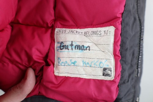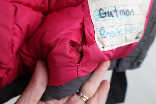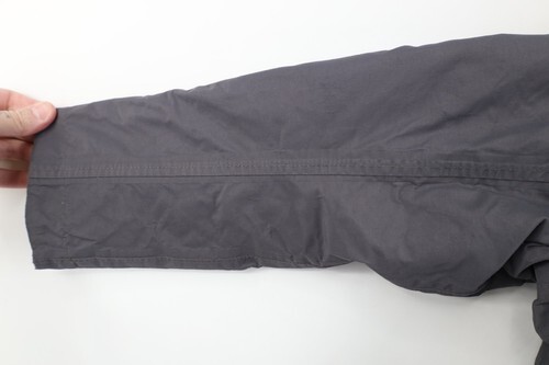 Missing hood. Blemishes front, pockets, arms. Collar, cuffs, inner lining discolored. Color faded. Hole inner lining