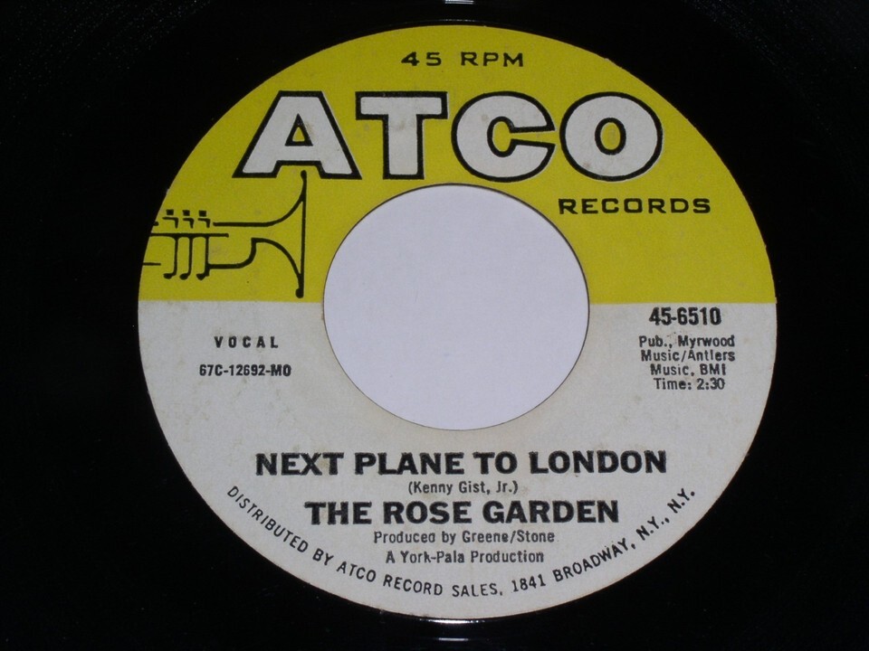 This is a vintage 45 rpm phonograph record by The Rose Garden, entitled, "Next Plane To London". Flipside: "Flower Town". Record label: Atco 45-6510.