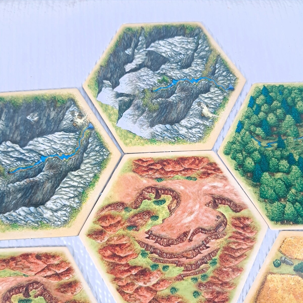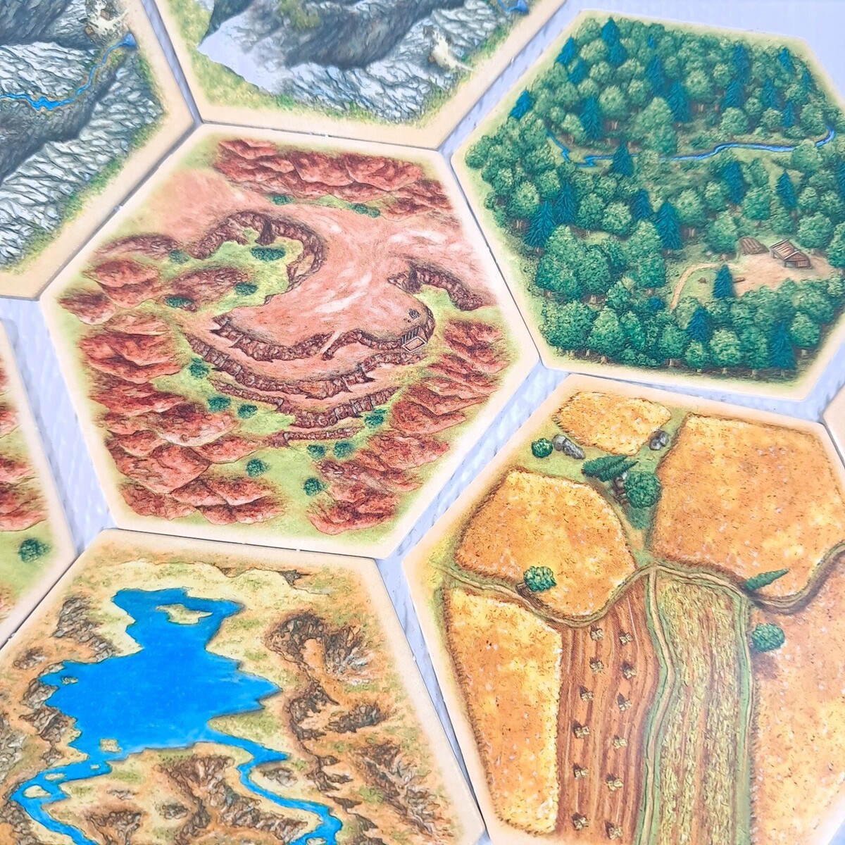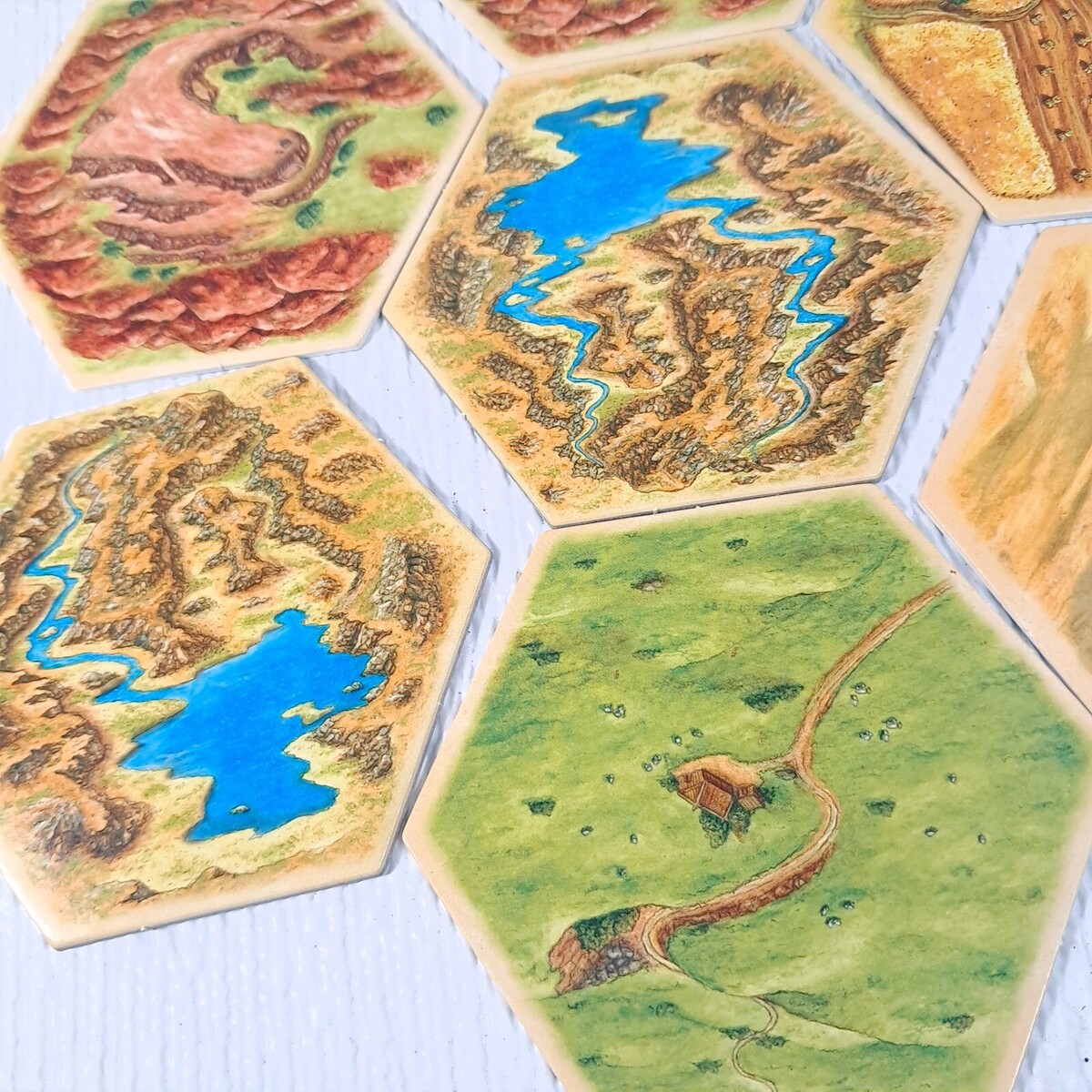 Includes 11 terrain hexes including: 2 gold field, 2 desert, 1 fields, 1 forest, 1 pasture, 2 mountains, 2 hills.