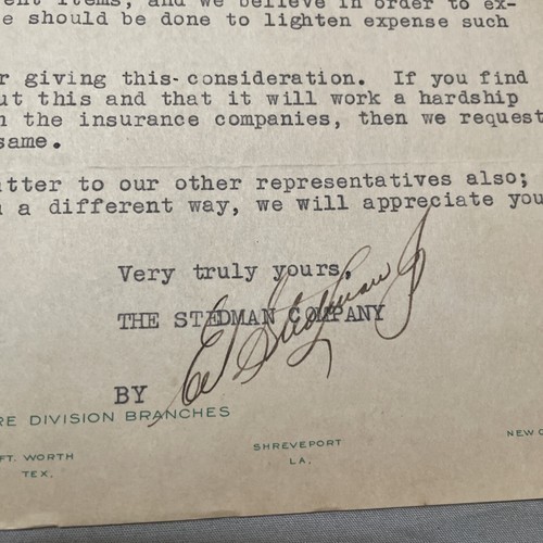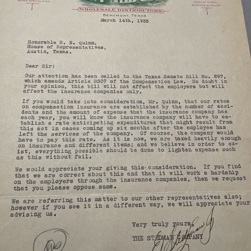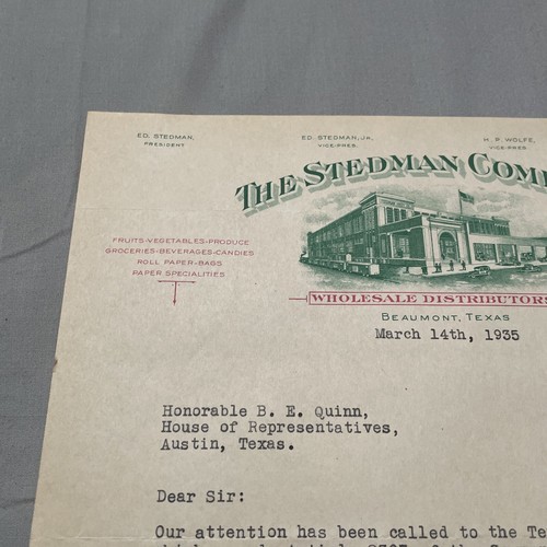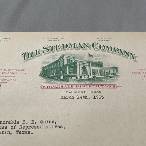 - The Stedman Company Letter Beaumont Tx 1935 signed Ed Stedman Jr Texas