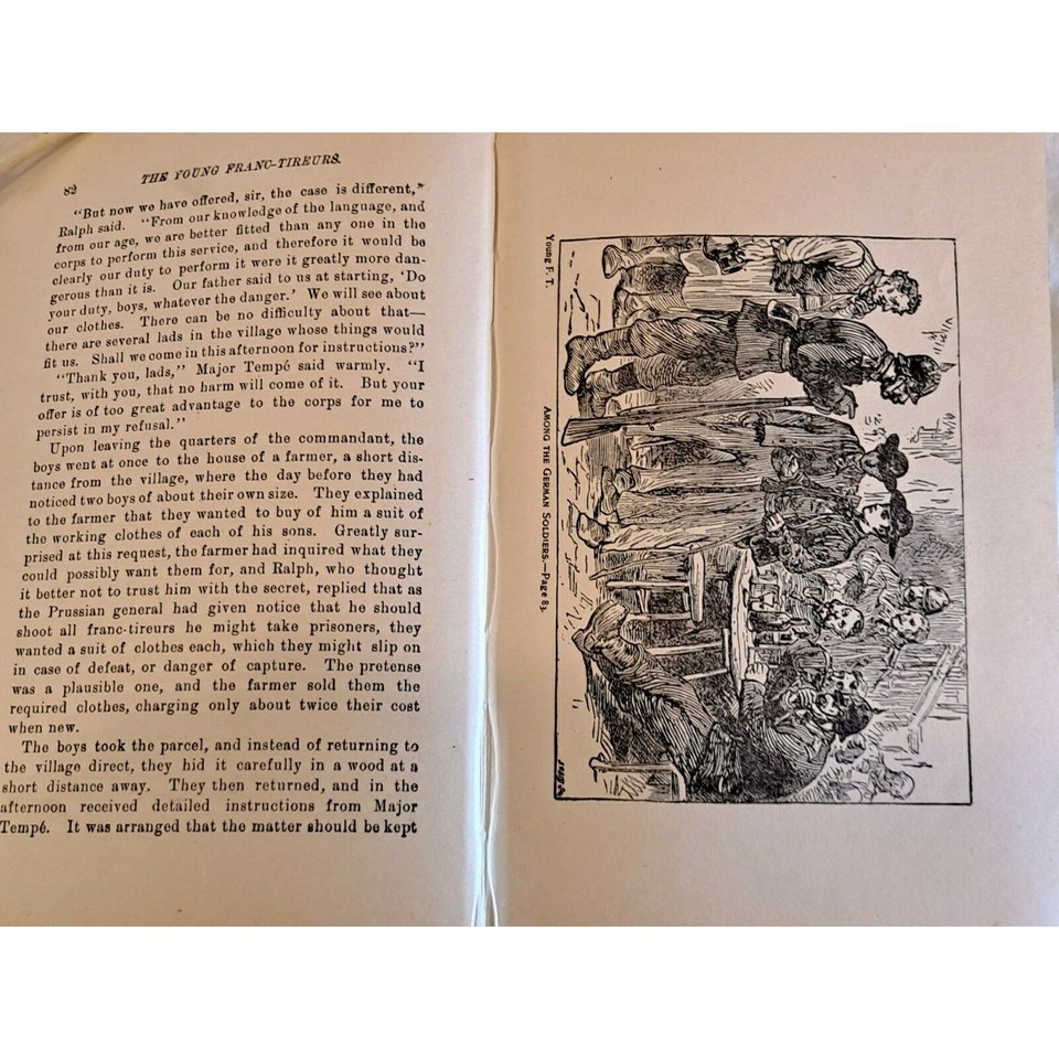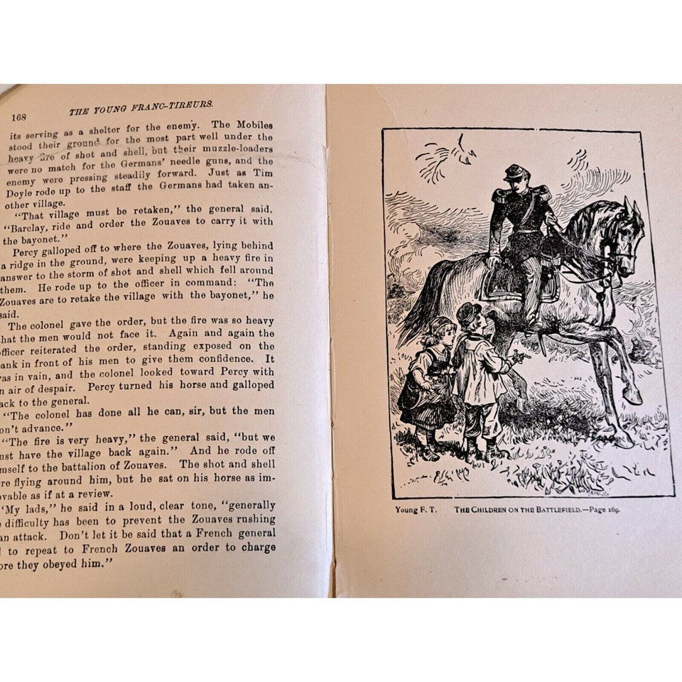 The Young Franc-Tireurs and Their Adventures in the Franco-Prussian War by G. A. Henty. According to the preface, was written a few months after the Franco-Prussian War ended in 1871. The names, places, and dates have been changed, but the circumstances and facts are true. Told from the French point of view, represents the action of the bodies of volunteer troops known as the franc-tireurs. vi + 335 + 14pp ads.
