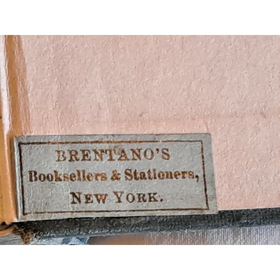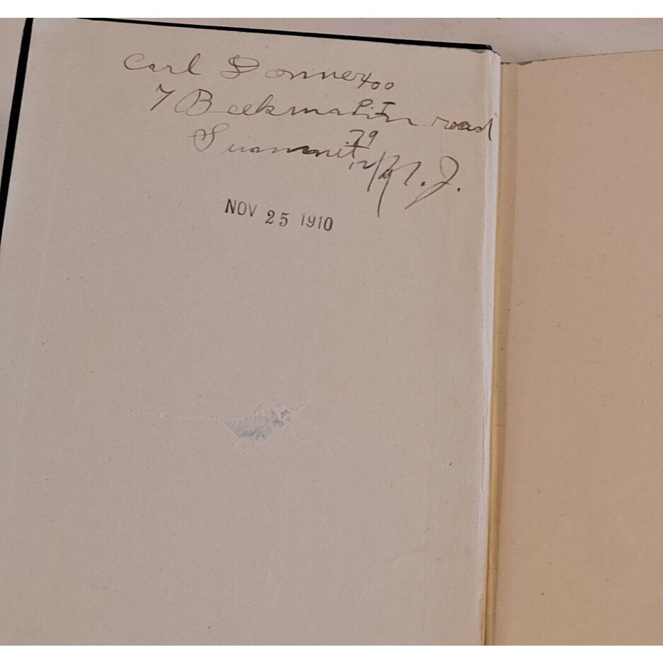 Hardcover has green cloth boards with 3 color illustrations lettering front and spine, but no DJ. Gold shadowbox holds title on spine. Page-edges tinted green by owner. Corners square not worn through, top of boards with wrinkles as if wet dried w/o damage. Interior is complete tight, torn pages stabilized with tape. Front paste-down has POS date stamp 1910. Text unmarked and Brentano's New York sticker on rear paste-down.