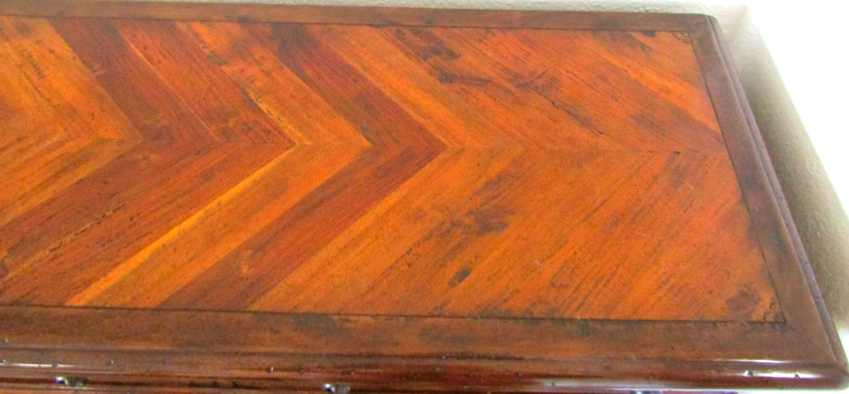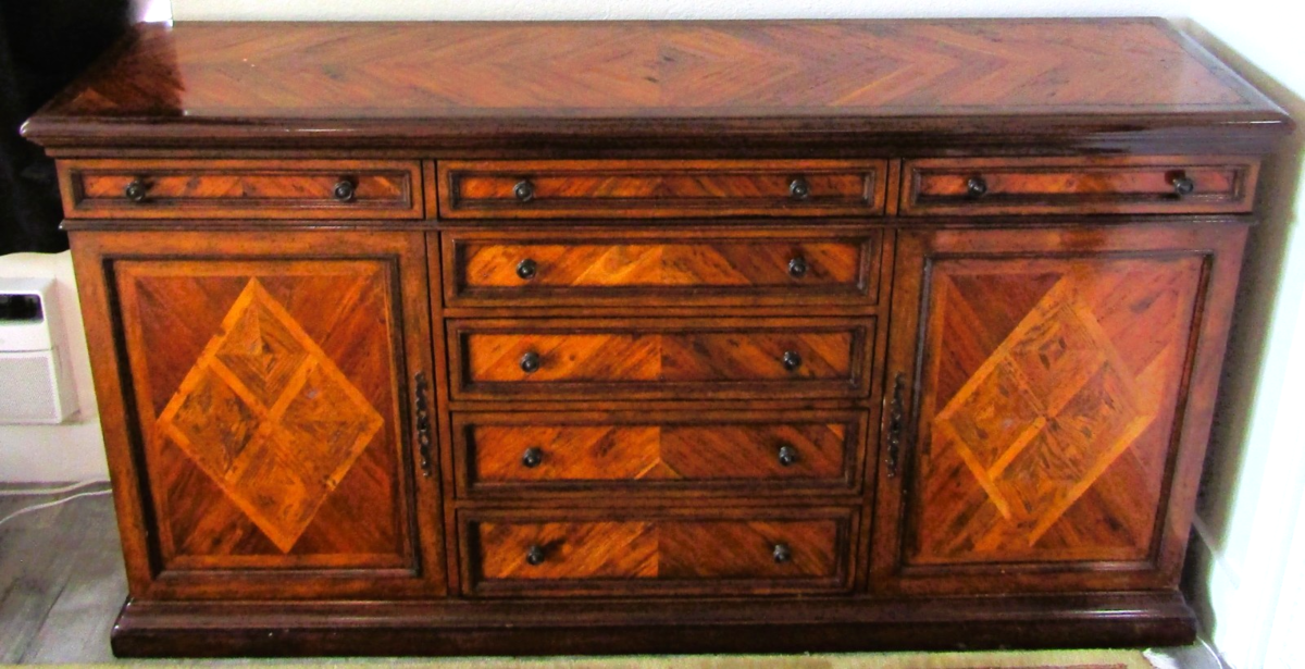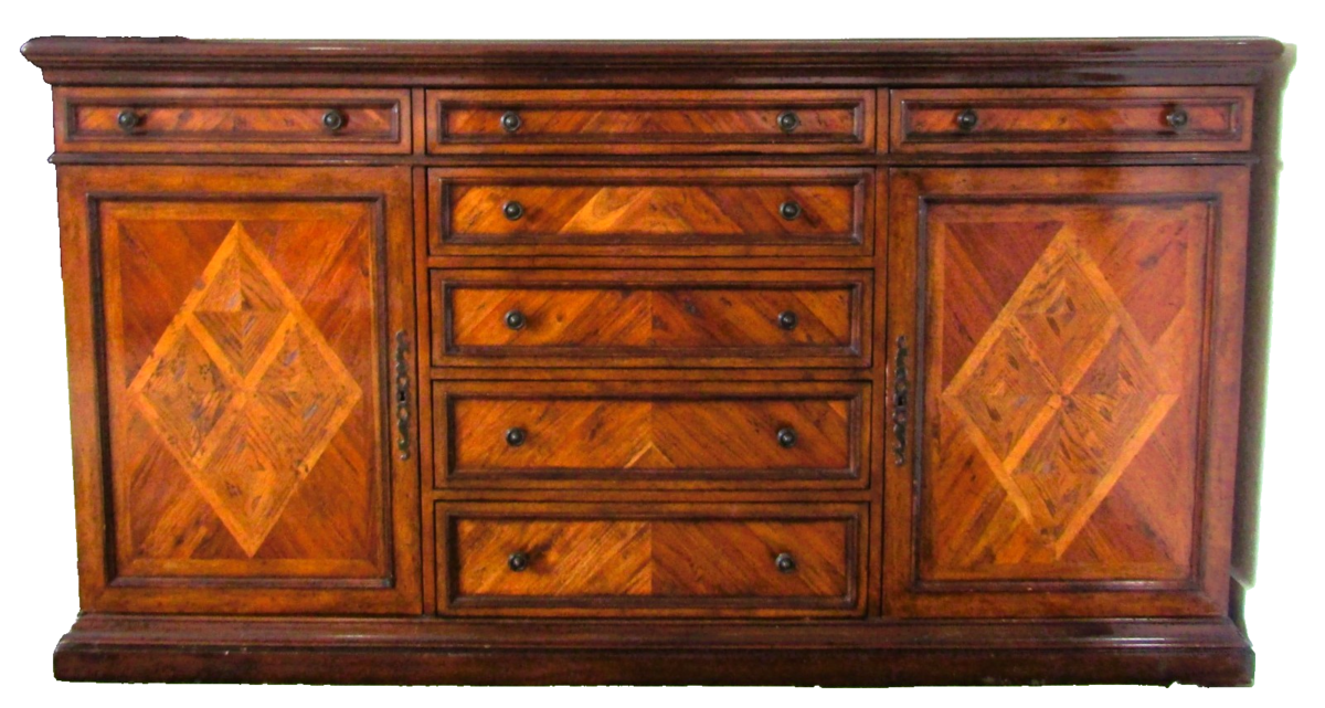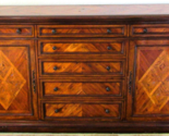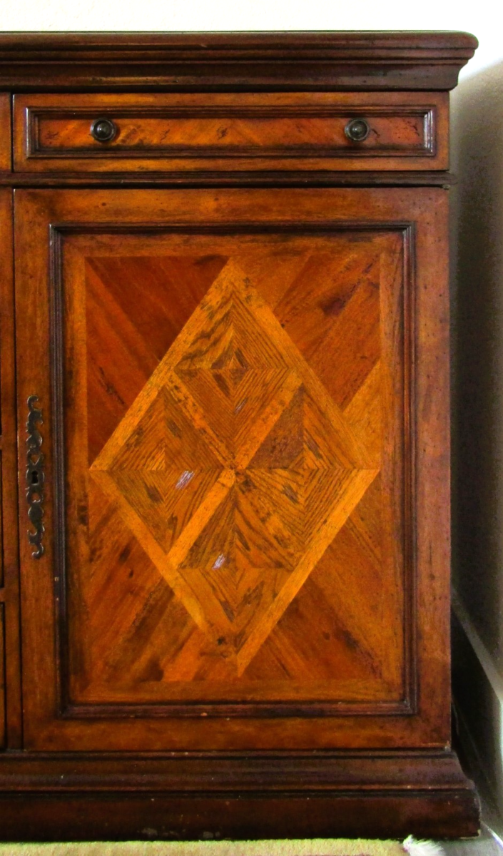 The antiqued wood side cabinet has three drawers over parquetry cabinet doors. The doors enclose an adjustable shelf. This style has been discontinued by the brand.