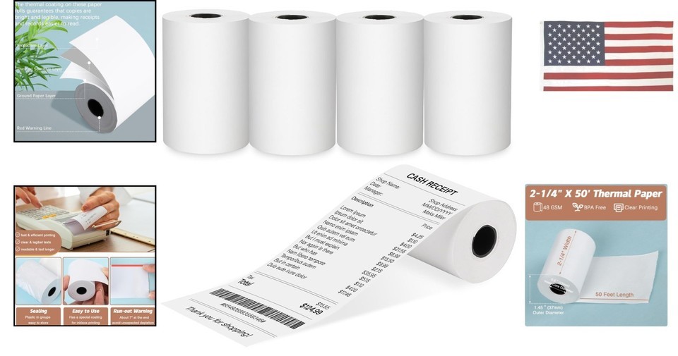 - Thermal Paper Receipt Rolls 2 1/4" x 50', 5 Rolls, BPA-Free, White
