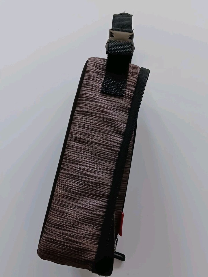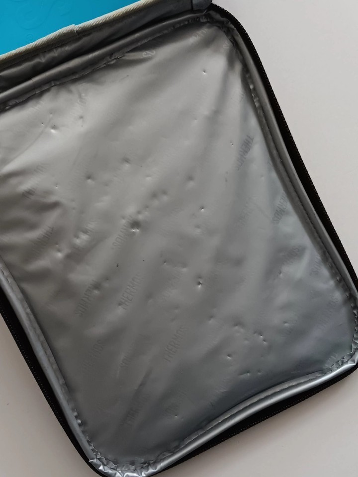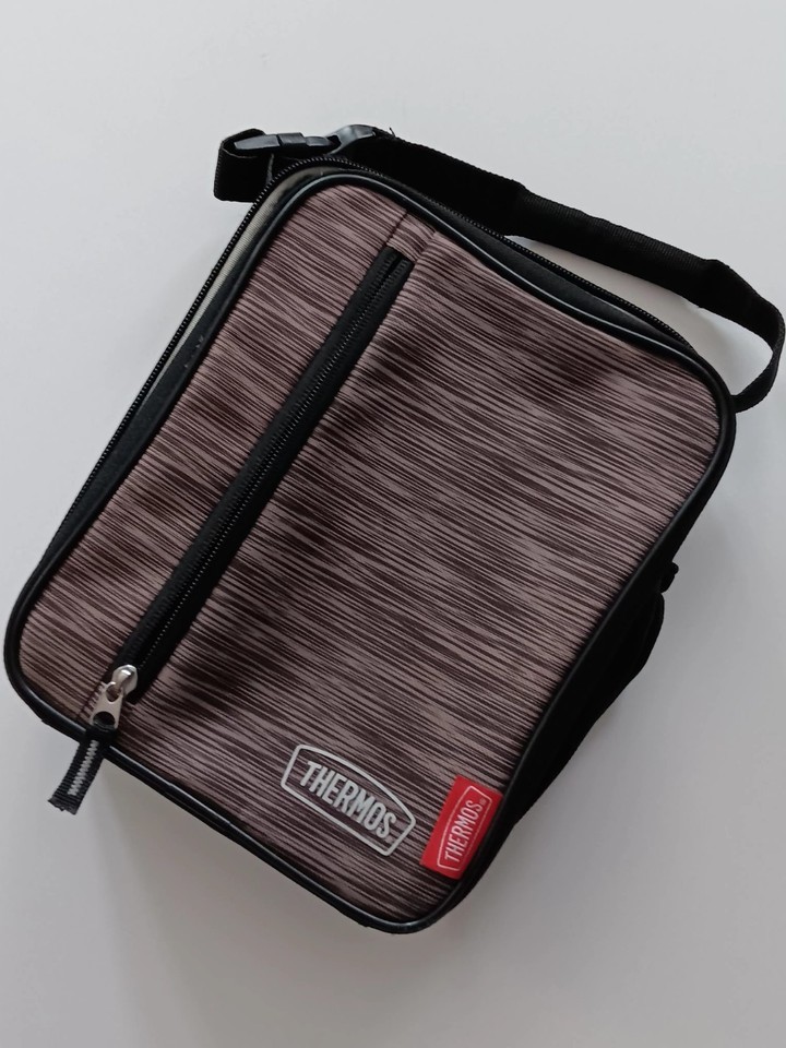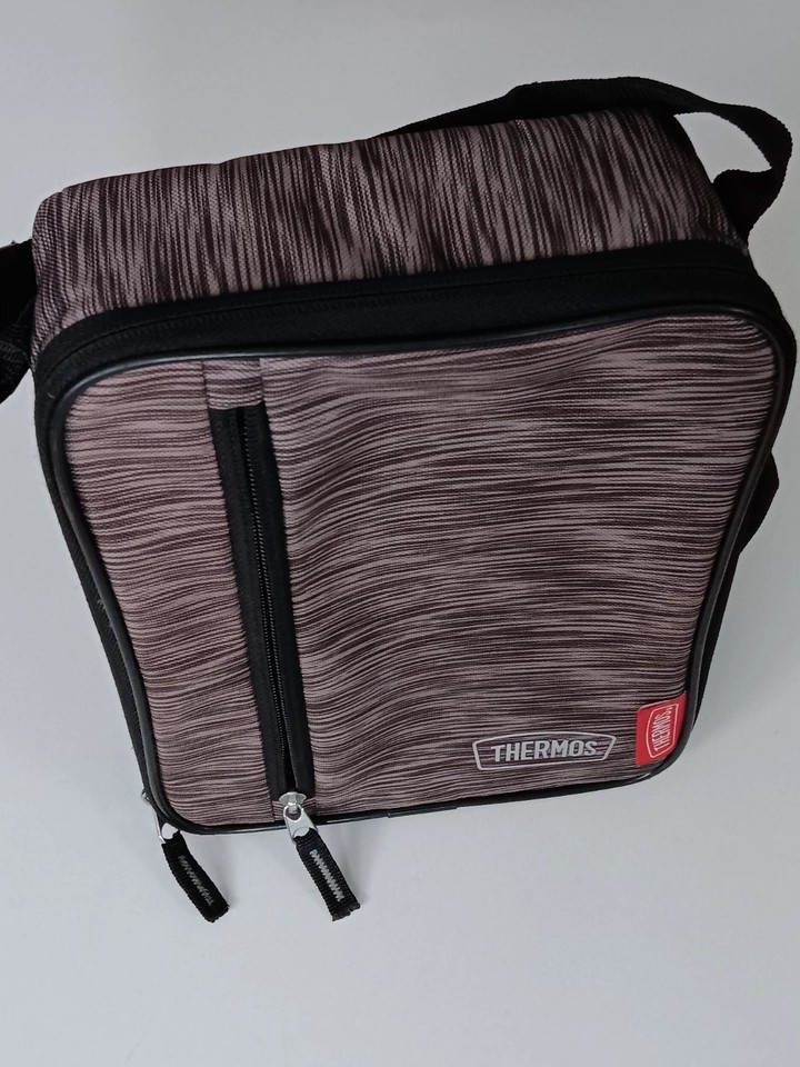 The Thermos Upright Insulated Lunch Box Bag in brown with dark brown lines and black accents is a stylish and functional lunch container. It features a striped pattern and three compartments for organized storage. The zip closure lid ensures secure sealing, and the insulated design helps keep food fresh. Made of nylon, canvas, and polyester, this rectangular lunch box is easy to clean and includes a handle for convenient carrying. Suitable for adults, teens, and kids, this Thermos lunch box is a practical choice for on-the-go meals. Normal wear. All sizes are approximate.