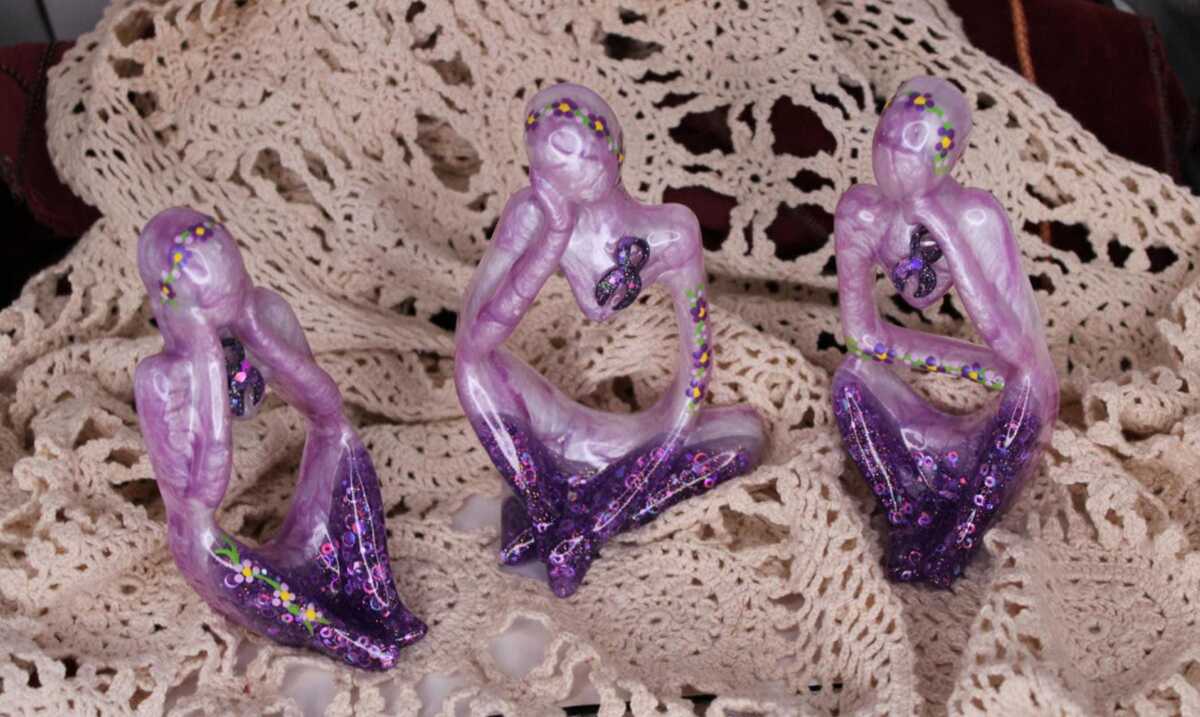 These Thinker statues come as a set of 3, pictured. Each has a purple ribbon for Pancreatic Cancer awareness. Would be wonderful in memory or in honor of someone. We can do other Cancer ribbons, just reach out. These are very personal to me. Pancreatic cancer took my Mother.