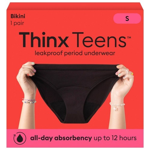 From the makers of Thinx, Thinx Teens is period underwear for teens who won?t let their period get in their way. The reusable period underwear looks and feels like regular underwear, but it?s designed with built-in period protection that?s leakproof all day up to 12 hours. The period panties feature an absorbent core layer that absorbs up to 3 regular pads? worth of flow*, and the moisture-wicking layer helps keep teens fresh and dry. From the period care experts at Thinx, Thinx Teens can be a total replacement for disposable period products, or can be worn as a backup to tampons or menstrual cups. Thinx Teens period underwear are machine-washable and reusable, so teens (and parents) can have peace of mind cycle after cycle. Simply machine wash your Thinx period underwear on cold, line dry, and repeat! Not for use on open cuts, abrasions or incisions. Replace at 30 washes. (*Individual Results May Vary)