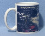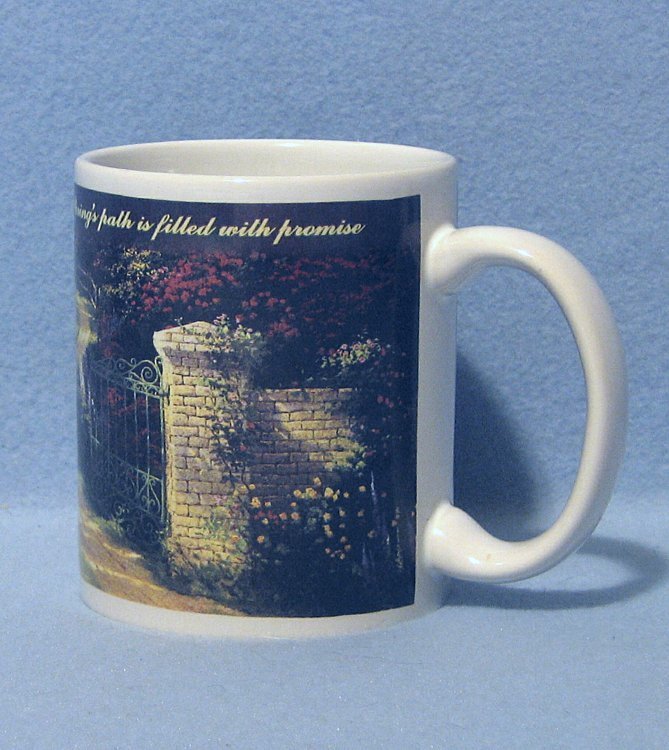 White Stoneware Coffee Mug with a Wrought Iron Gate in a Stone Wall Opened to a Winding Drive with Rustic Wood Fencing, Budding Trees, Shrubs and Lots of Flowers. "Spring's path is filled with promise." in White on a Grey Band around the Top. "From a Thomas Kinkade Oil Painting"