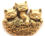Three Kittens in Woven Basket Flower Pin Gold Tone Figural Cat Animal Jewelry