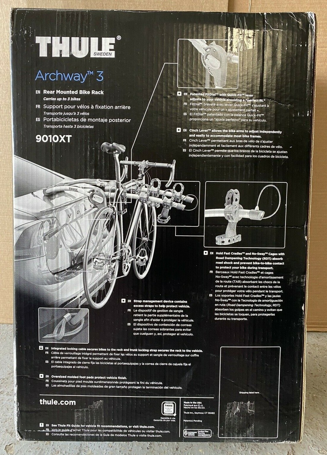 This is for a brand new in box Thule Archway 3 Bike Trunk Mounted Carrier 9010XT Features Integrated locking cable secures bikes to the rack and the trunk locking strap secures the rack to the vehicle Patented Fit Dial with Quick-Fit lever adjusts to your vehicle providing a "perfect fit" Anti-sway cages prevent bike-to-bike and bike-to-vehicle contact Stay-Put cradles with soft-saddle material protect your bike's finish Long arcing tubes provide more clearance over car spoilers providing a greater amount of vehicle fits Cinch Lever allows the bike arms to adjust independently and easily for unique bike frames Oversized molded pads protect vehicle finish Folds up flat for convenient storage