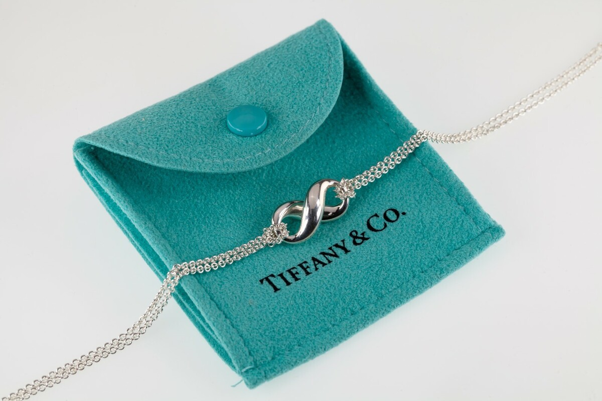 - Tiffany & Co. Sterling Silver Infinity Pendant w/ Double Chain Box + Pouch