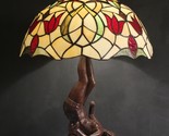 An impressive Tiffany style lamp featuring a heavy bronze base depicting a young lady in an acrobatic pose mounted on a stool.