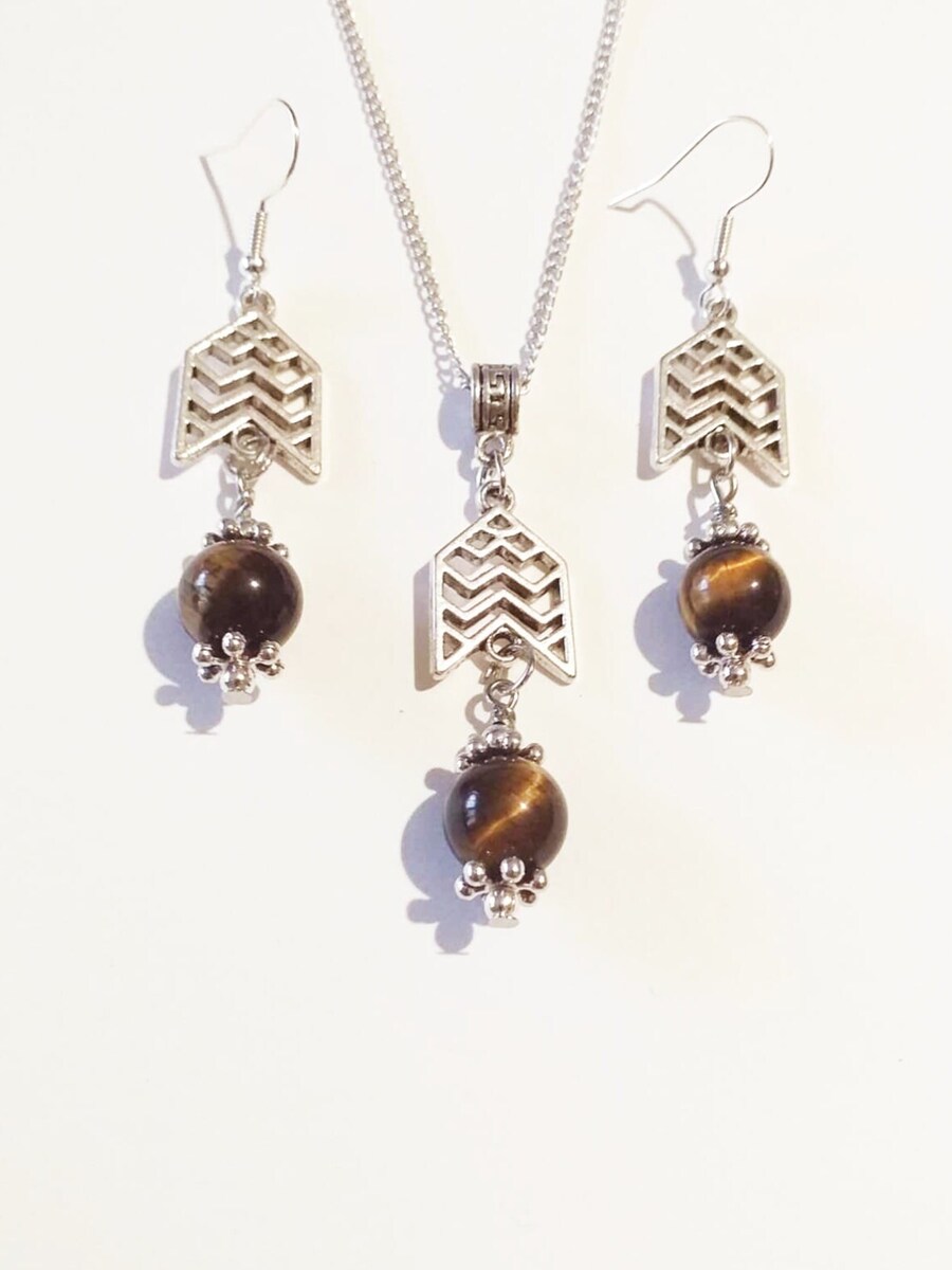 - Tiger's eye Silver jewelry set earrings and necklace Victorian jewelry set Boho