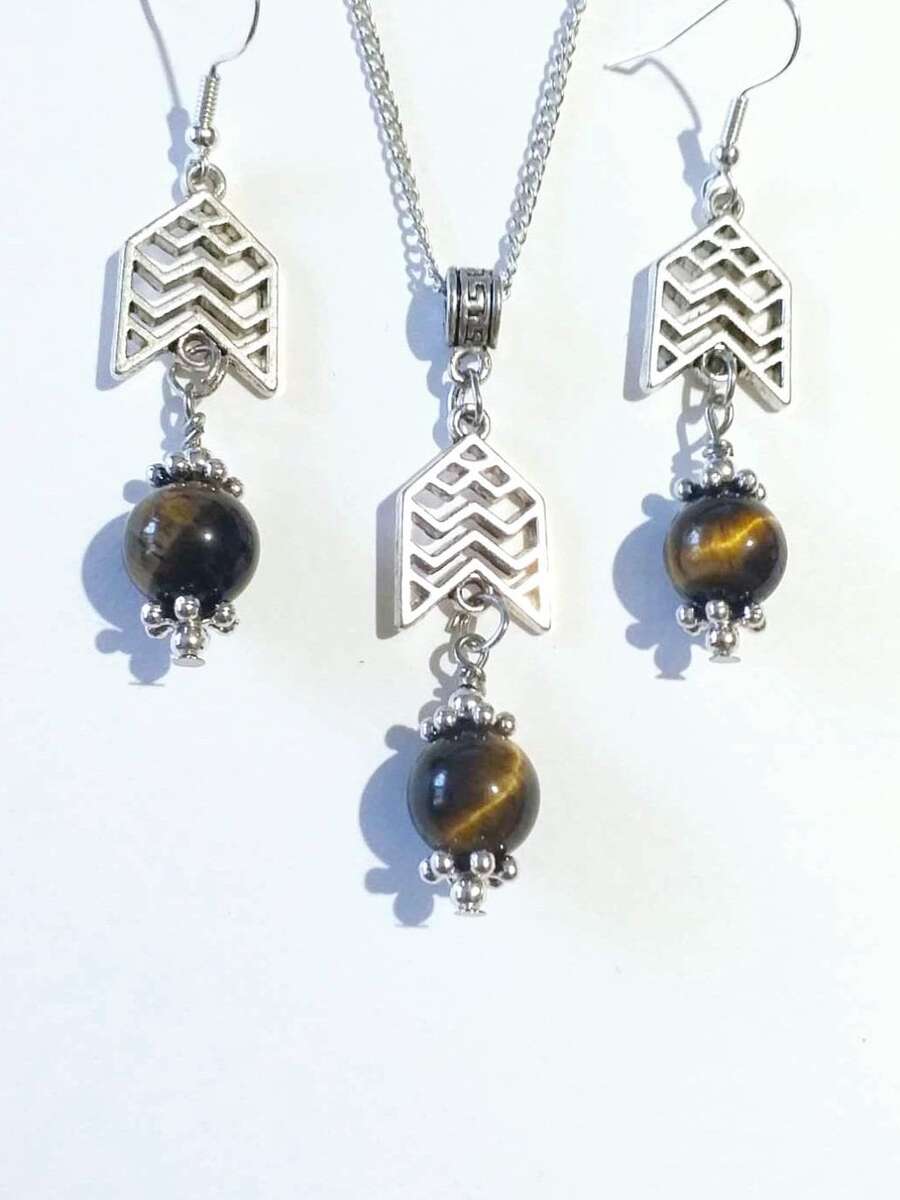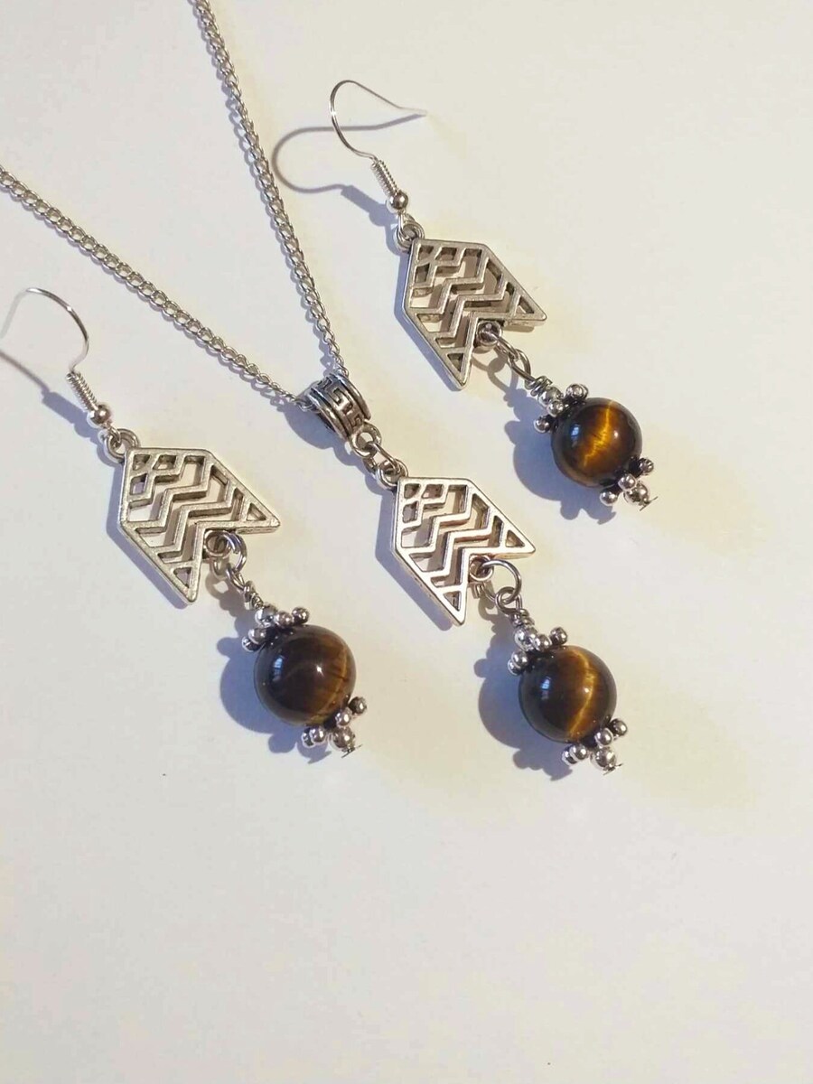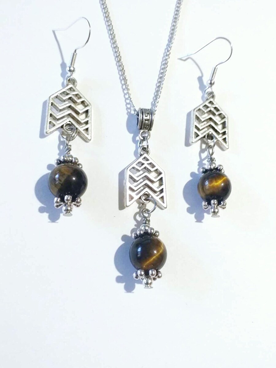 Beautiful silver-tone Antique Viking style Tiger eye set necklace and earrings . Silver-tone filigree set earrings and pendant necklace . Victorian style earrings and necklace . Boho earrings and necklace. Romantic jewelry set earrings and necklace. Beautiful earrings and necklace with Tiger eye gemstone .