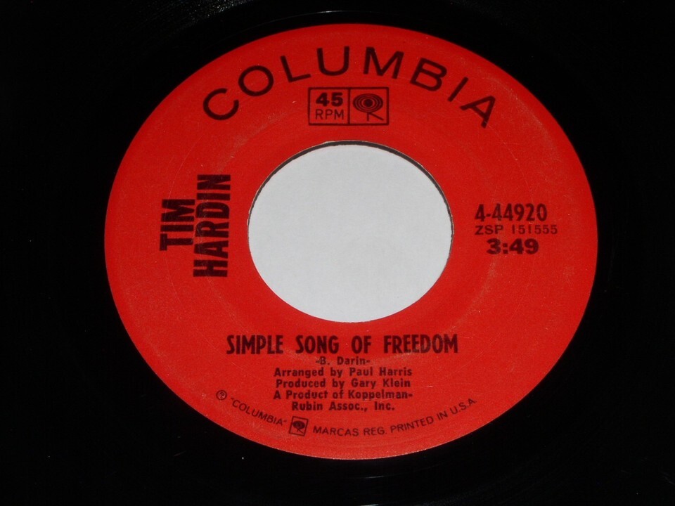 This is a vintage 45 rpm phonograph record by Tim Hardin, entitled, "Simple Song Of Freedom". Flipside: "Question Of Birth". Record label: Columbia 4-44920.