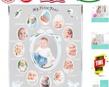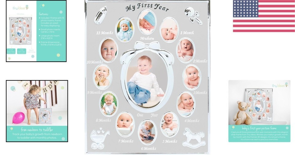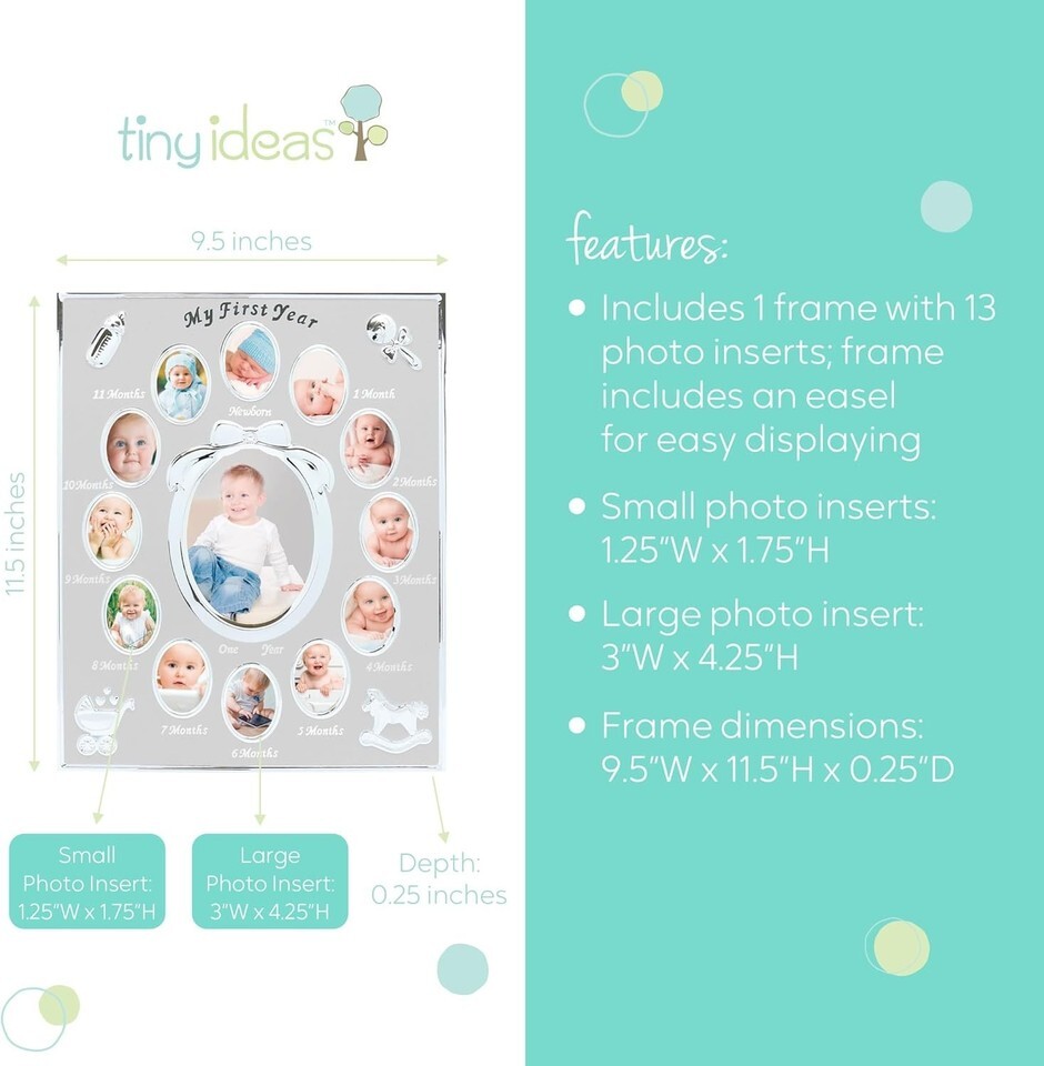 Tailored for capturing your baby's first- milestones, this frame measures 9.5? W x 11.5? H. It features room for twelve 1.25? W x 1.75? H monthly photographs and one larger 3? W x 4.25? H picture for that big O-N-E. Perfectly sized to commemorate their whirlwind first .
