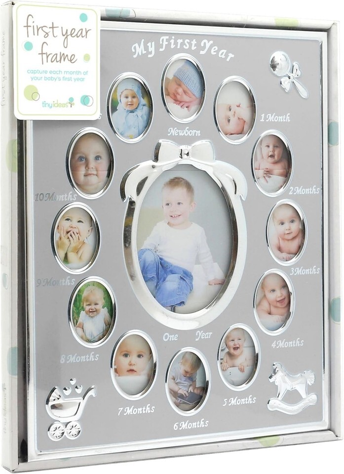 Decorate your little one?s nursery with this cherished keepsake frame. One minute, you're cradling a newborn, and the next, they're walking and talking. While it?s impossible to capture every day, this classic silver milestone picture frame allows you to treasure those moments forever. Slide a new photo into one of the twelve labeled slots, relishing the changes from 'newborn' to '11 ', while the large center slot celebrates their one- birthday picture.