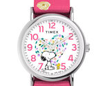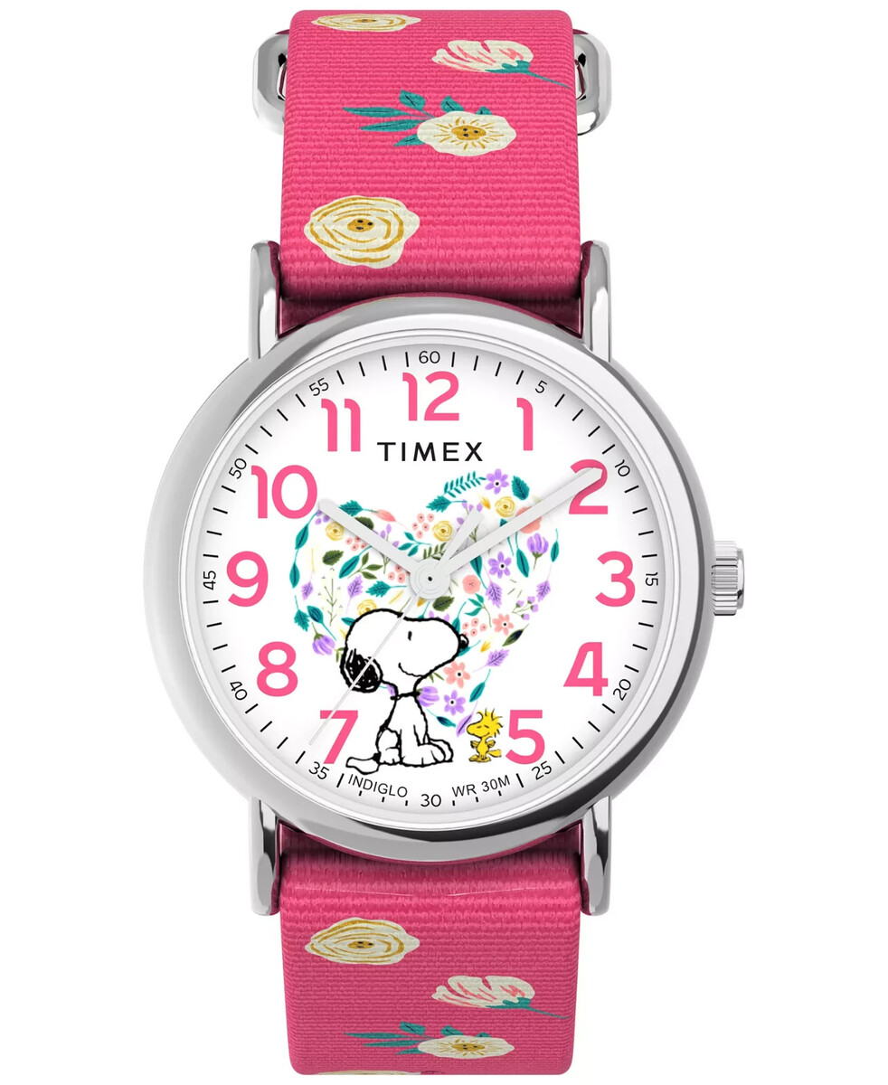 Bring the abundant beauty of nature to your look with our Timex Weekender x Peanuts collection. The pink slip-thru fabric strap is adorned with crisp floral graphics, while Snoopy and Woodstock stop and smell the flowers on the white dial. Complete with a silver-tone case and INDIGLO backlight, each brings a graceful touch to your everyday style. Plus, it perfectly complements our smaller 34mm Timex Color Rush x Peanuts watch, making it easy to coordinate an adorable look with your bestie.
