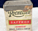 Tiny Richelieu Saffron Spine Tin Paper Over Metal Label Sprague Warner 1 7/8" the label has a few chips and the tin has some rust spots