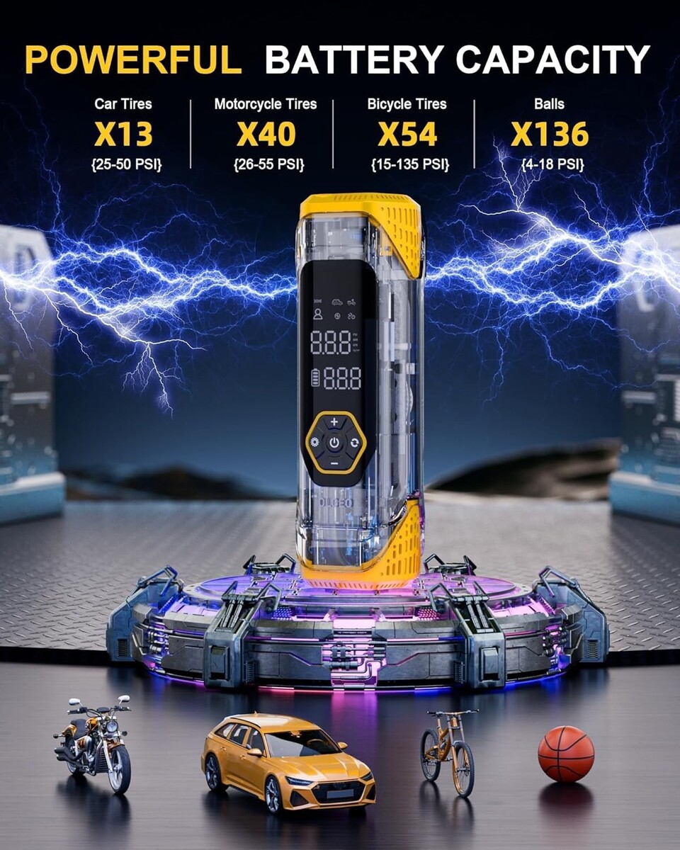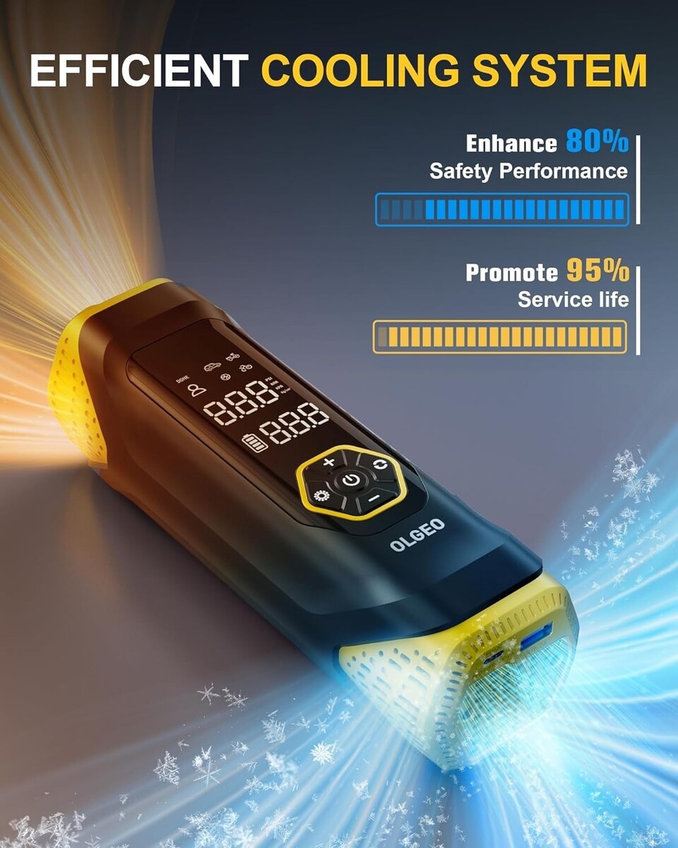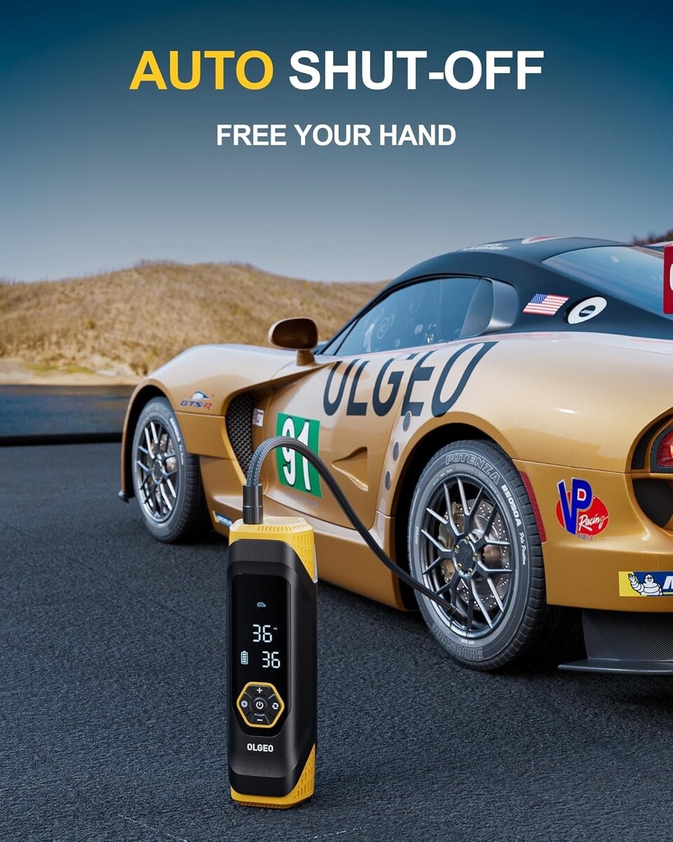 ?Smart Air Tire pump,Auto shut-off?Engineered over three years, the OLGEO smart chip achieves 90% accuracy by sampling tire pressure 350 times per second?80% above market standards. With five preset modes (Car, Motorcycle, Bicycle, Ball, Custom), the car tire inflator automatically shuts off at your target PSI for safe, effortless operation.