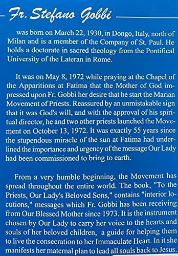 Product description: It was on May 8, 1972 while praying at the Chapel of the Apparitions at Fatima that the Mother of God impressed upon Fr. Gobbi her desire that he start the Marian Movement of Priests. Reassured by an unmistakable sign that it was God's will, and with the approval of his spiritual director, he and two other priests launched the Movement on October 13, 1972. It was exactly 55 years since the stupendous miracle of the sun at Fatima had underlined the importance and urgency of the message of Our Lady had been commissioned to bring to earth. From a very humble beginning, the Movement has spread throughout the entire world. This book contains "interior locutions," messages which Fr. Gobbi has been receiving from Our Blessed Mother since 1973. It is the instrument chosen by Our Lady to carry her voice to the hearts and souls of her beloved children, a guide for helping them to live the consecration to her Immaculate Heart. In it she manifests her maternal plan to lead all souls back to Jesus.