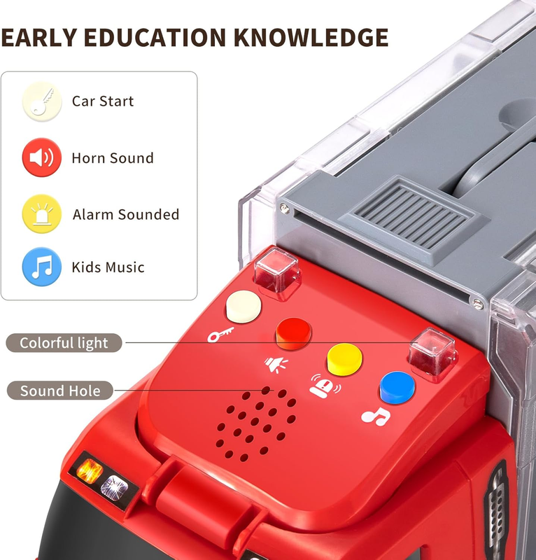KIDS EARLY EDUCATION KNOWLEDGE - Our fire truck toy, with early education function. Through 4 buttons in front of the truck, your child will see the flashing light, hear the ultra-realistic engine sound, the alarm and the plenant music. Ideal for parent-child education, cultivate children's imagination and creativity. There is a need for 2 AAA batteries (not included).