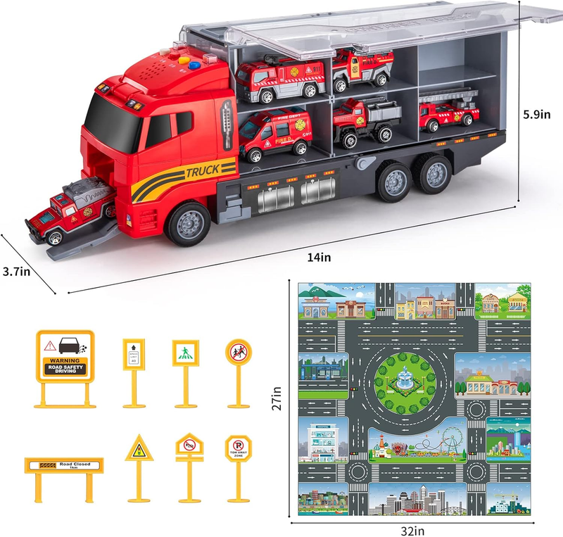 MULTIFUNCTIONAL FIRE TRUCK TOYS SET - Equipped with 1 foldable play mat, 1 multi-function transport cars, 1 water cannon vehicle, 1 medical ambulance, 1 ambulance, 1 fire Armored Car, 1 ladder truck die cast car , 1 lifting fire truck and a set of road signs.