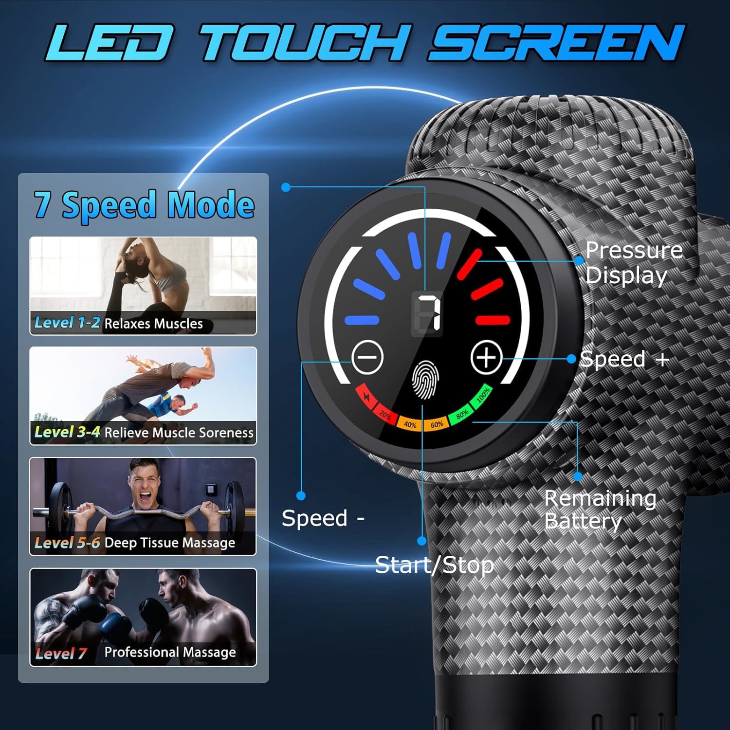 Deep Tissue Massager, TOLOCO Massage Gun relieves muscle tension and pain, improves circulation and breaks down lactic acid. 7 Speed Levels. The deep tissue massager has 7 speeds, you can adjust the speed according to your needs, 2200-3300rpm, which can meet the needs of ordinary people, athletes and fitness professionals, etc. The noise level is less than 40 decibels, suitable for use at home, gym, office, physical therapy room, etc. 10 Massage Heads. Suitable for relaxing muscles in various parts of the body, such as back, shoulders, leg and so on. The handle is non-slip design, even if your palms are sweaty after exercise, the massage gun will not slip off. Bring you a better using experience. LED Display. Large display shows speed level, remaining battery and massage pressure. High-quality battery can be used for a long time, and the USB charger is convenient and quick to charge. Exquisite packaging make this massage gun more convenient to carry.