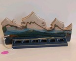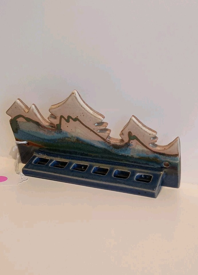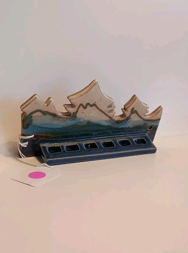 The "Toothbrush Holder Wall Mount Bonnema Potters Mountains Art Pottery Bethel Maine" is a handmade pottery toothbrush holder featuring a mountain design by Bonnema Potters from Bethel, Maine. It has a country style with a blue, brown, and white color scheme. The item is wall-mounted and made of pottery, with a diameter of approximately 1.5" and measuring 7.5" in length and 4" in height at the highest point of the mountain. This toothbrush holder is a unique and artistic addition to any bathroom, suitable for adults. Pre-owned, normal wear. No Hardware included!