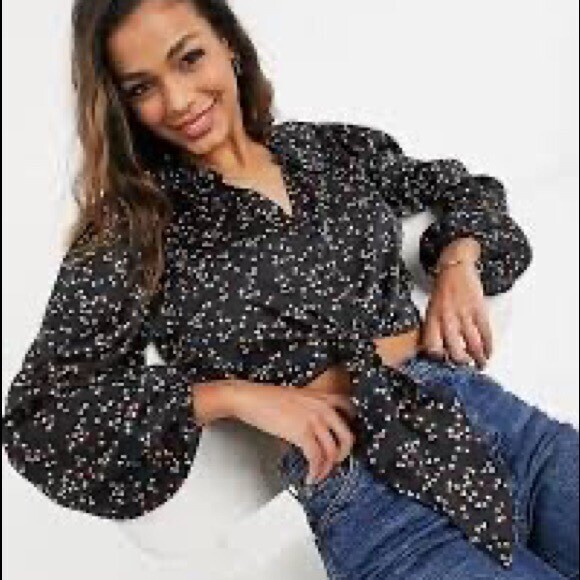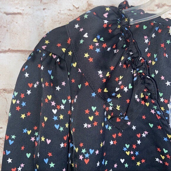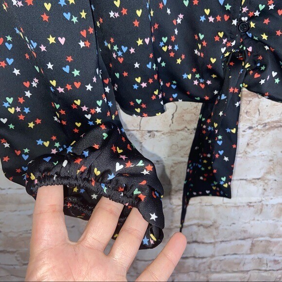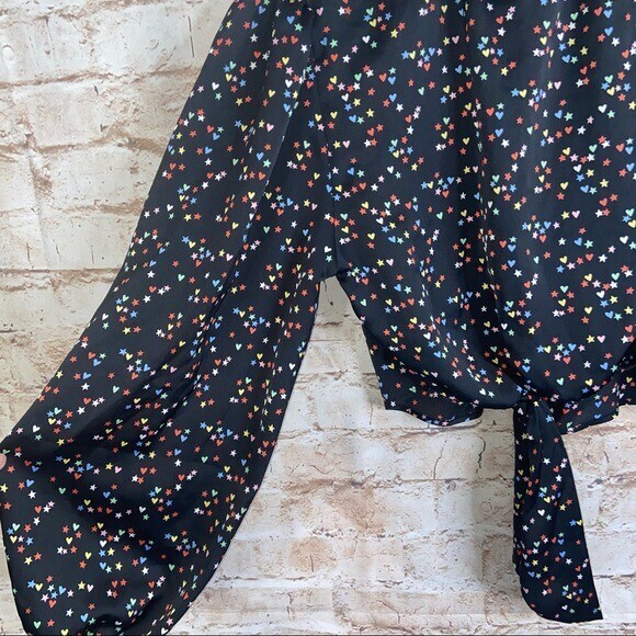 Topshop Star and Heart Print Tie Front Cropped Blouse in Multi Size 6 NWT - Polyester - silky satin top with billowy balloon sleeves and a ruffle collar shows a playful side with a tie crop hem and colorful star and heart print. Front button closure; ties at front V-neck Long sleeves with elastic cuffs Crop hem