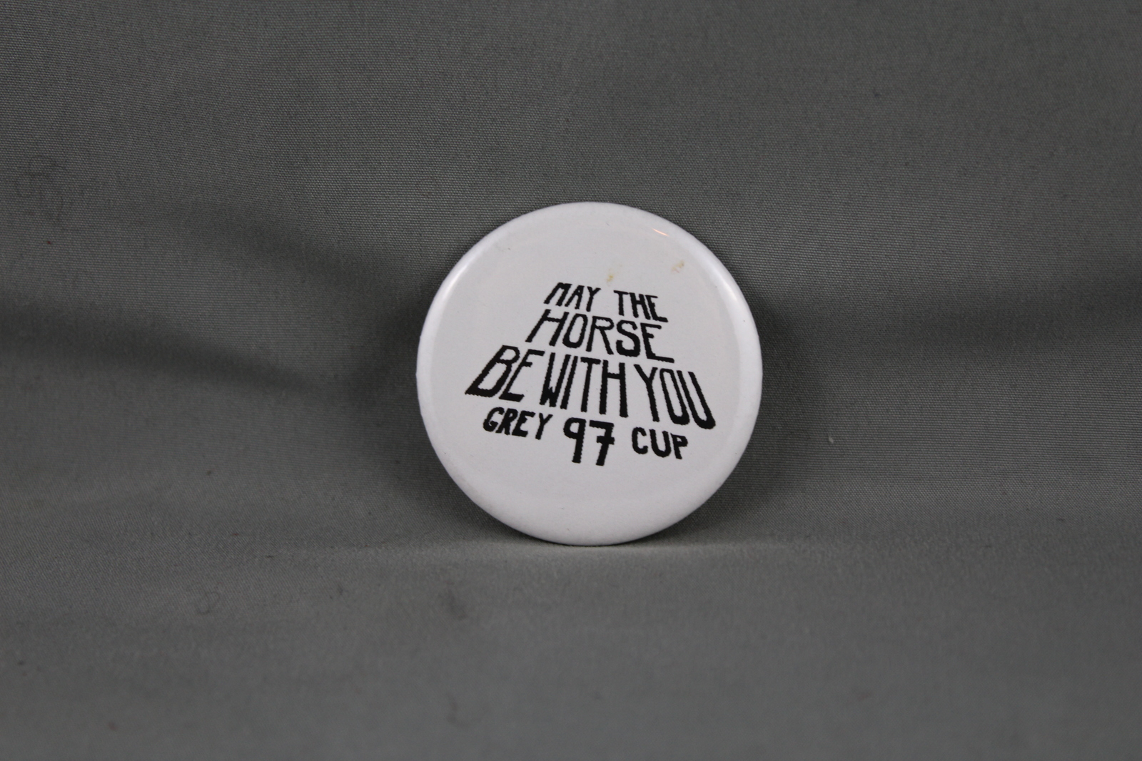 Up for sale is a vintage CFL pin. It has a white base colour with may the horse be with you Grey Cup 97 screened on in black. What a great addition to any collection.